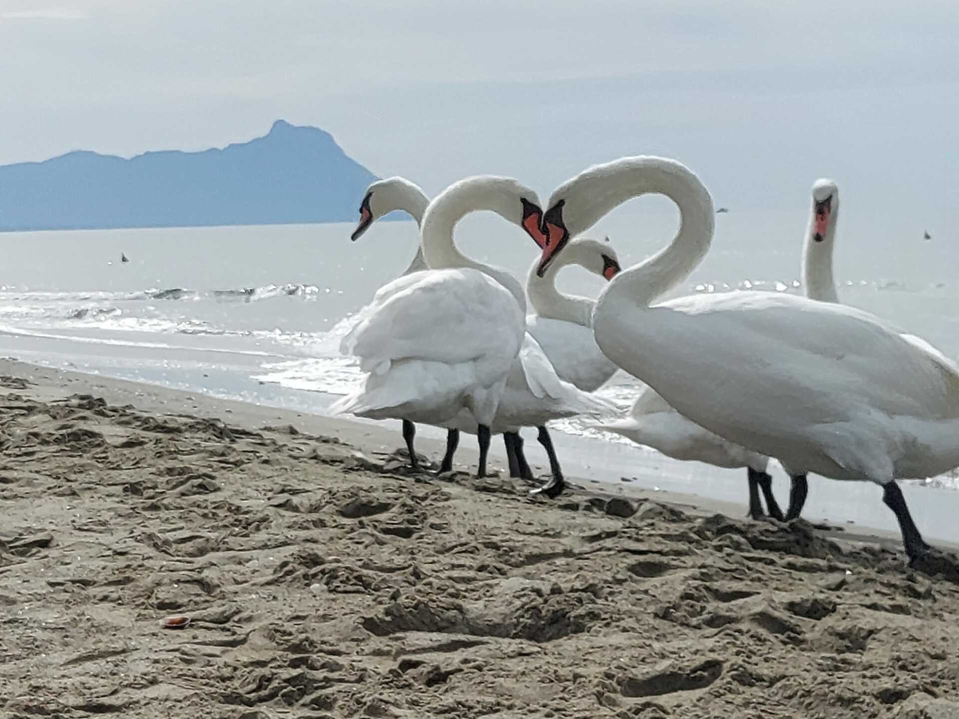 Cigni bianchi sulla spiaggia di Latina Lido