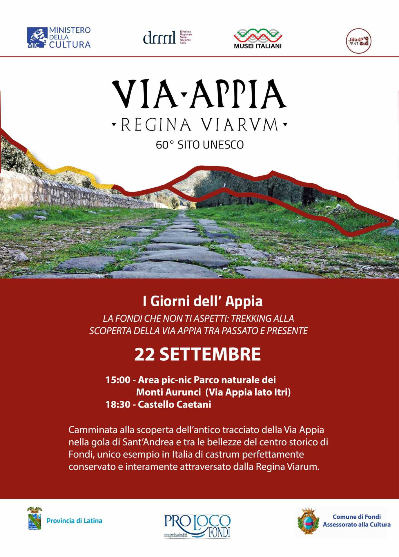 L’evento “La Fondi che non ti aspetti – Trekking alla scoperta della via Appia tra passato e presente” si svolgerà domenica 22 settembre in collaborazione con l’Associazione Pro Loco Fondi, E consisterà in due trekking distinti ma complementari: uno tra le bellezze naturali e archeologiche del territorio e uno alla scoperta dei segreti urbani di Fondi.