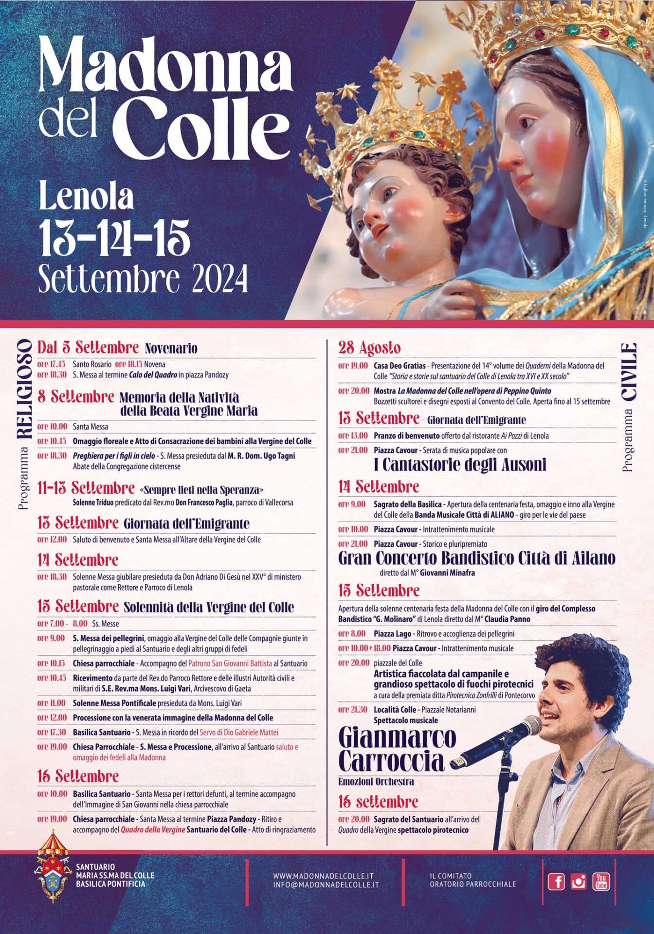 Le celebrazioni hanno preso il via il 5 settembre, poi l’8 la “XVIII Rievocazione storica Maria SS.ma del Colle” con 250 figuranti in abiti d’epoca e il tradizionale passaggio del “Gonfalone del Pellegrino”. “Un’opportunità unica per riscoprire e vivere le profonde radici storiche e spirituali di Lenola, in un percorso che intreccia fede, tradizione e senso di comunità”, dicono gli organizzatori dell’associazione storico culturale “Ynola”, promotrice dell’evento.