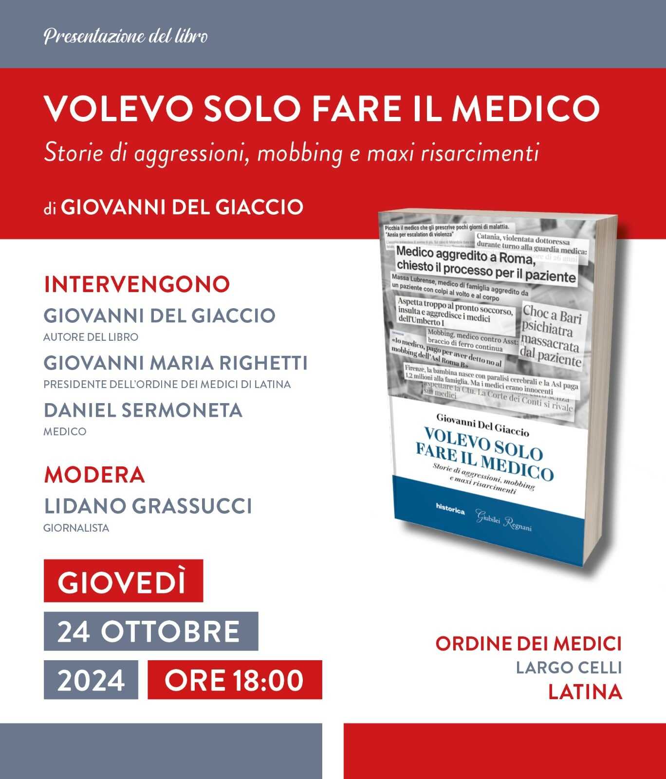 LATINA – Le aggressioni ai medici e al personale sanitario stanno facendo notizia, ma sono un fenomeno che si trascina da tempo. Ne parla in “Volevo solo fare il medico. Storie di aggressioni, mobbing e maxi-risarcimenti” (edito da Giubilei Regnani) il giornalista de “Il Messaggero” Giovanni Del Giaccio.