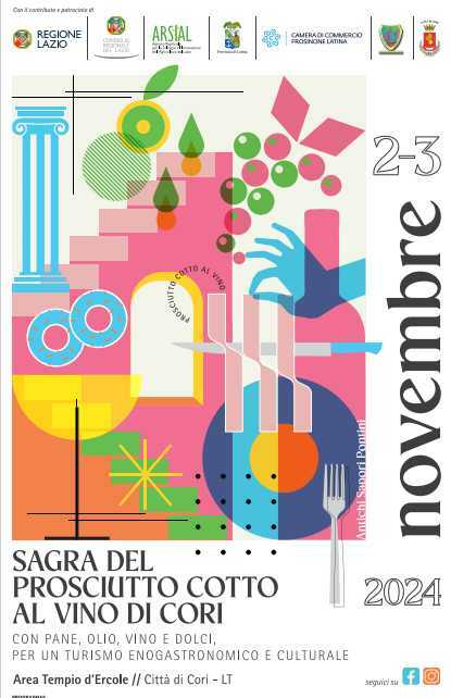 CORI – Si terrà sabato 2 e domenica 3 novembre a Cori la “Sagra del Prosciutto cotto al vino di Cori con pane, olio, vino e dolci per un turismo enogastronomico e culturale”. La manifestazione nell’area del tempio di Ercole prenderà il via nel pomeriggio di sabato alle 15:30 con l’esibizione degli sbandieratori del Leone Rampante di Cori e l’apertura degli stand. Parteciperanno circa 30 produttori.