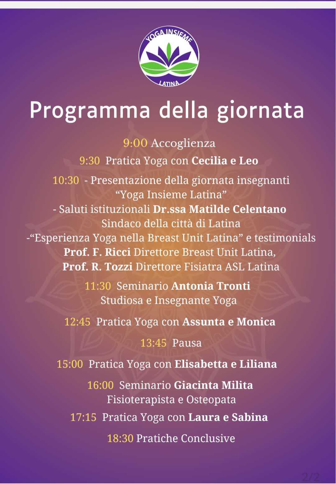 Uno spazio della mattinata è dedicato all’esperienza del corso yoga settimanale che il gruppo insegnanti svolge da quattro anni presso la Breast unit di Latina, diretta dal prof Fabio Ricci , che interviene all’evento, insieme al dott. Roberto Tozzi, direttore fisiatra della Asl di Latina. Completeranno l’intervento le testimonianze delle donne, pazienti-allieve, in cura per tumore al seno.