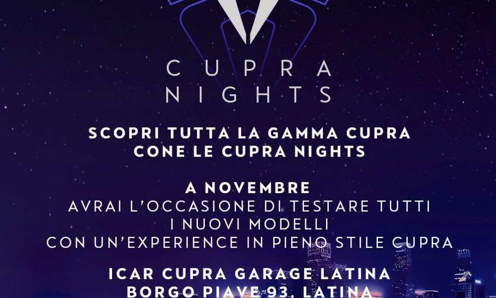 LATINA – Il 22 novembre, si accenderanno i riflettori su una serata che promette di essere unica, fuori dagli schemi e totalmente immersiva: la CUPRA Night. Un evento esclusivo che avrà luogo presso l’ICAR CUPRA Garage in Via Piave, 93, dalle 19:00 alle 23:00, riservato solo su invito e su iscrizione. (Prenota ora il tuo posto: https://cupra.icarspa.it/cupra/cupra-nights)