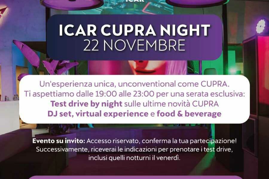 La CUPRA Night è più di un evento: è un’opportunità esclusiva per immergersi nello spirito del brand CUPRA, scoprendo un nuovo modo di vivere la guida, l’intrattenimento e l’innovazione. Non perdere questa occasione di vivere una serata che sfida le convenzioni e celebra l’autenticità.