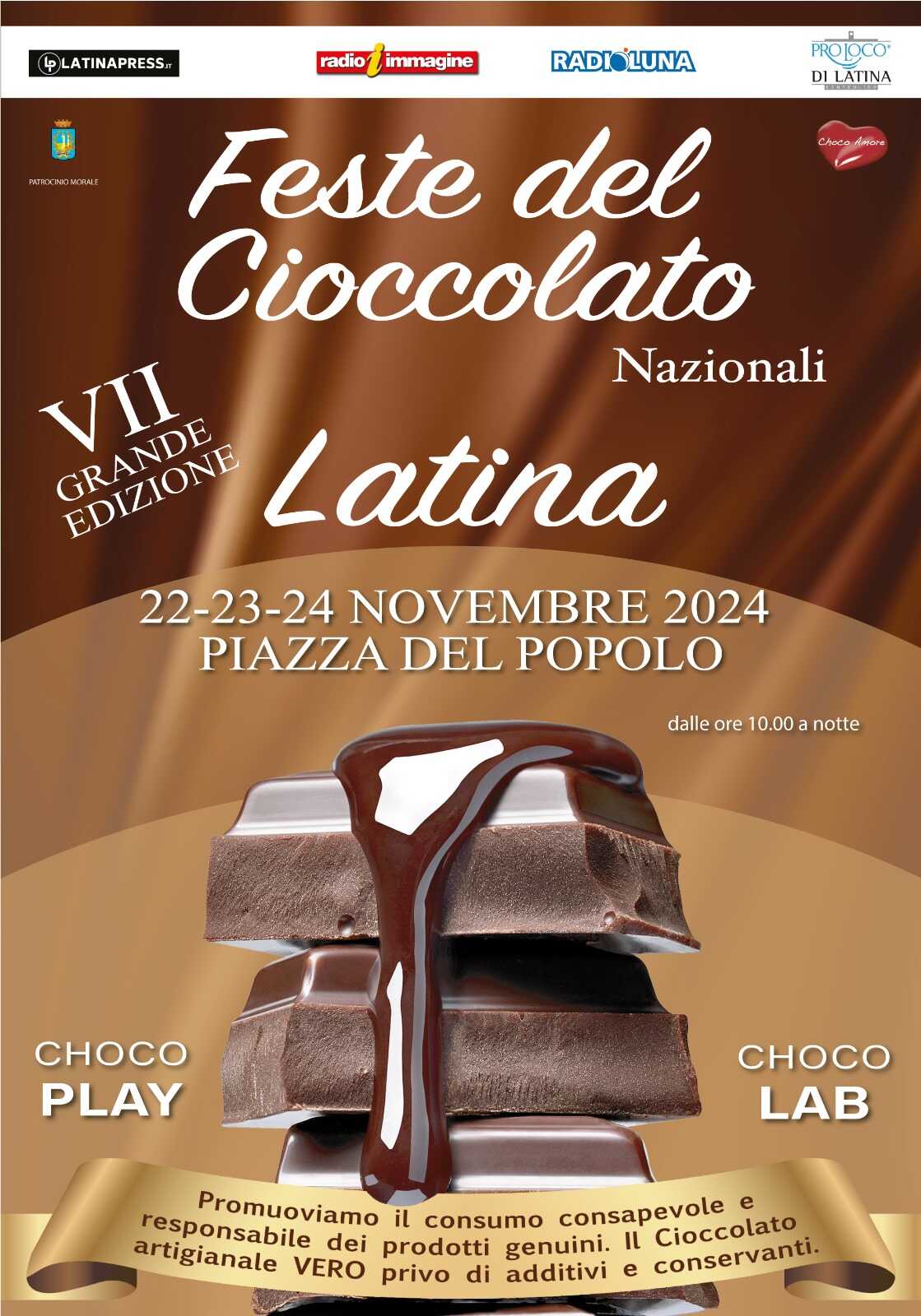 LATINA – Come ogni anno torna a Latina, in Piazza del Popolo, dal 22 al 24 novembre, la Festa del Cioccolato Artigianale. Con il patrocinio del Comune, i cioccolatieri dell’Associazione Nazionale “Choco Amore”, porteranno in piazza squisitezze proposte nelle varie ricette regionali. Dalle 10 della mattina fino a notte, sarà un’occasione unica per assaporare le migliori prelibatezze al cioccolato: dalla raffinata pralineria agli spezzati, dal gianduiotto con tutte le specialità piemontesi, al cioccolato con la frutta secca, allo speziato, al cremino prodotte tutte a base di cioccolato considerato “puro” perché, a differenza di quello industriale, è privo di additivi e conservanti.