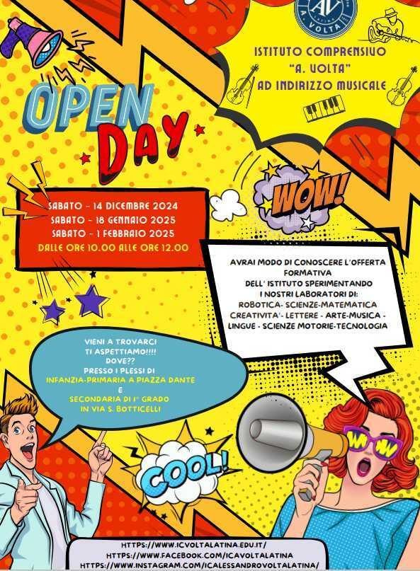 LATINA – Una comunicazione nuova, in stile fumetto, lancia la stagione degli Open Day dell’Istituto Comprensivo Alessandro Volta di Latina, in vista delle iscrizioni al prossimo anno scolastico. Sulla locandina le notizie essenziali: tre date, sempre di sabato, il 14 dicembre 2024, il 18 gennaio e il 1° febbraio 2025 (dalle 10 alle 12), unite all’immagine di una scuola che si aggiorna per avvicinarsi alle generazioni che si prepara ad accogliere e formare.