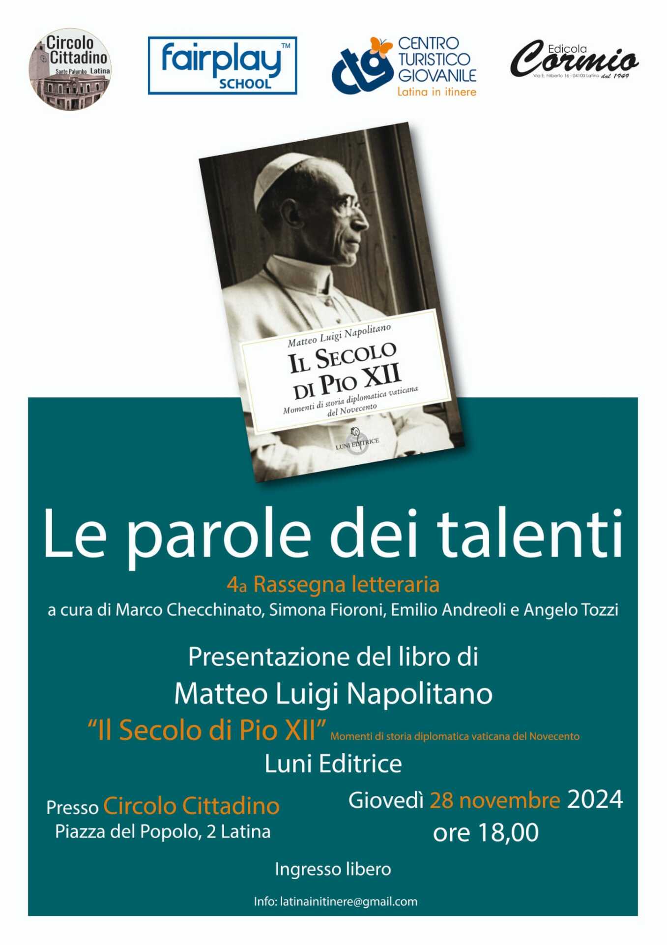 LATINA – Quarto appuntamento con le “Le parole dei talenti”, la rassegna letteraria a cura di Marco Checchinato, Angelo Tozzi, Emilio Andreoli e Simona Fioroni che ogni giovedì ospita, alle ore 18 al Circolo Cittadino “Sante Palumbo” di Latina, autori della provincia pontina e non solo. Questa volta sarà il turno dello scrittore Matteo Luigi Napolitano e del libro “Il secolo di Pio XII. Momenti di storia diplomatica vaticana del Novecento”.