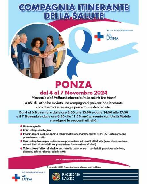 PONZA – Approda a Ponza il viaggio della Compagnia itinerante della Prevenzione, un programma di promozione della salute in 20 tappe promosso dalla ASL Latina con l’obiettivo di “sensibilizzare – spiegano dall’Azienda sanitaria locale in una nota – la popolazione sull’importanza degli screening oncologici e la valutazione dei fattori di rischio per malattie croniche non trasmissibili. L’iniziativa è particolarmente significativa perché nasce con la finalità di garantire una maggiore accessibilità ai servizi sanitari in aree urbane particolarmente disagiate e insulari. La presenza del truck prevalentemente composto da 5 ambulatori e un mammografo costituisce, infatti, una risposta concreta alle esigenze della popolazione locale, garantendo attività di prevenzione direttamente sul territorio”.