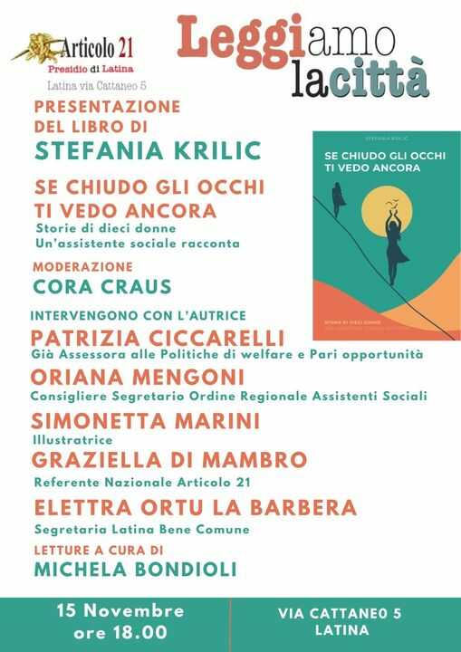 LATINA – Sarà presentato oggi a Latina, negli spazi di Latina Bene Comune in Via Cattaneo 5 , “Se chiudo gli occhi ti vedo ancora” il libro di Stefania Krilic che racconta dieci storie di donne con gli occhi dell’assistente sociale.