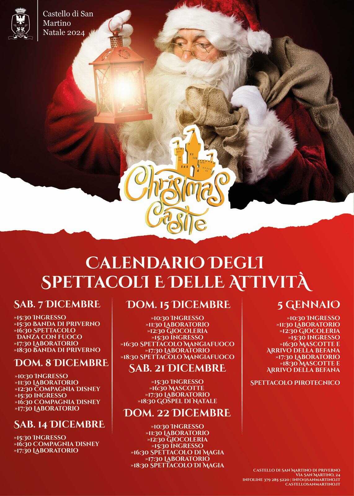 PRIVERNO – Il castello di San Martino a Priverno si veste di magia per le feste con luminarie, animazione per bambini, musica, artigianato e street food. E’ il Christmas Castle che apre finalmente le sue porte sabato 7 dicembre, per sette giornate tutte nei fine settimana delle festività, il sabato, nelle giornate del 7, 14 e 21 dicembre dalle 15:30 – 19:30; mentre la domenica, nelle giornate dell’ 8, 15, 22 dicembre e il 5 gennaio anche al mattino:0 dalle 10:30 – 13:30 e dalle 15:30 – 19:30).