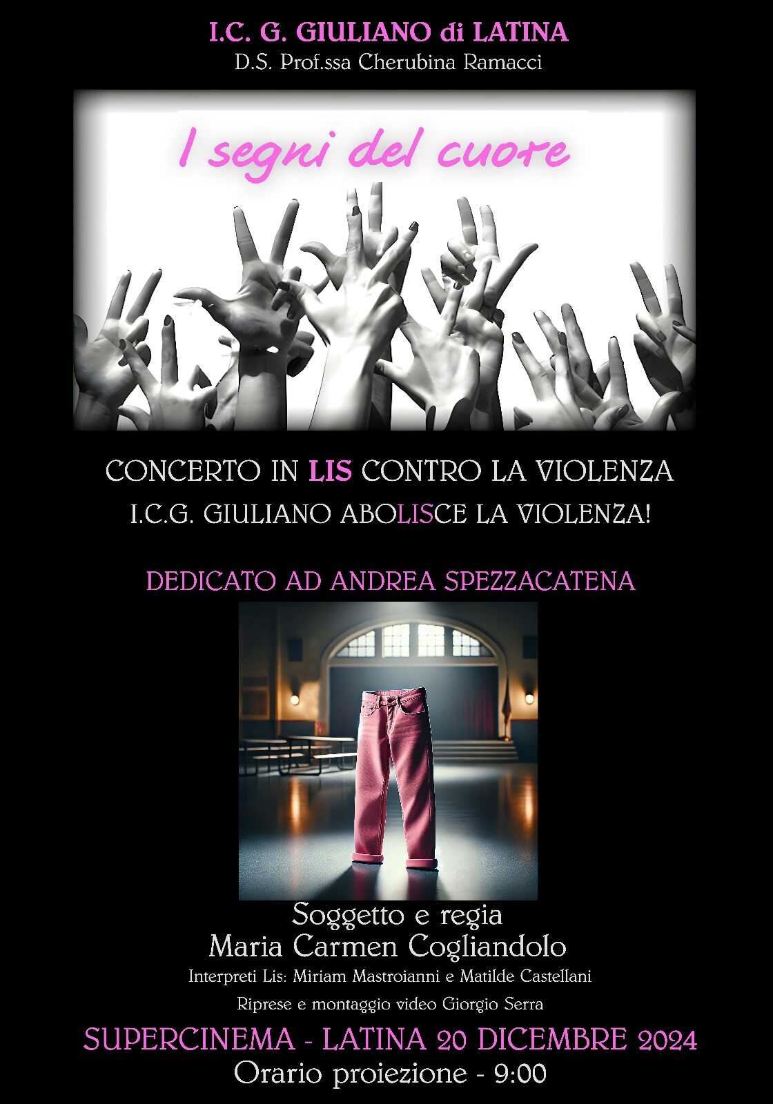 LATINA – Sarà proiettato domani, 20 dicembre, al Supercinema di Latina, il concerto realizzato in LIS, il linguaggio dei segni, dal titolo “I SEGNI DEL CUORE” ideato e diretto dalla professoressa e pianista dell’Ic Giuliano, Maria Carmen Cogliandolo, con le interpreti Lis Miriam Mastroianni e Matilde Castellani. “Vogliamo farlo vedere agli studenti delle altre sezioni che non lo hanno mai visto, condividendo con loro i temi importanti trattati e sarà un modo per augurarsi Buon Natale in un modo diverso”, spiega l’insegnante della scuola guidata dalla dirigente scolastica Cherubina Ramacci.