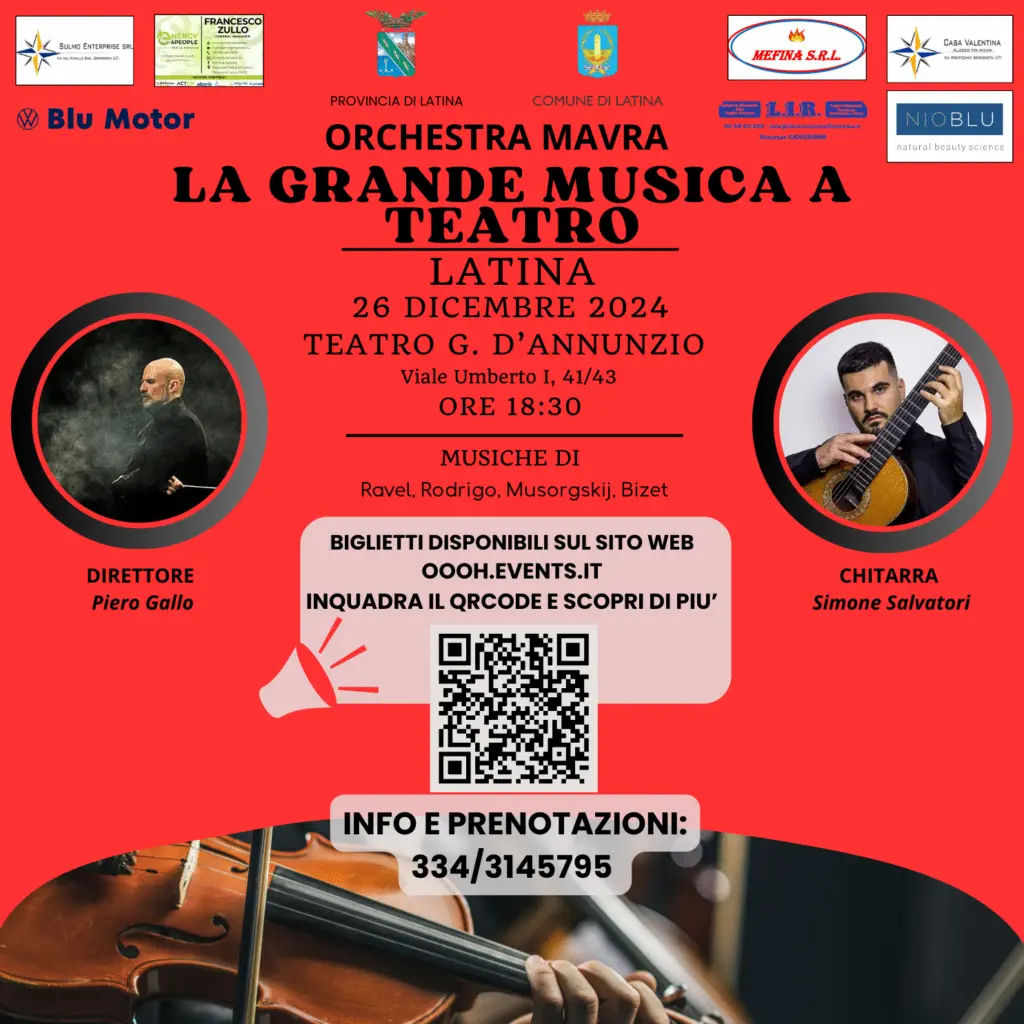 LATINA – “La Grande Musica a Teatro” è il titolo del concerto in programma giovedì 26 dicembre, giorno di Santo Stefano, al Teatro Gabriele D’Annunzio di Latina alle ore 18.30, protagonista l’ Orchestra Mavra diretta dal Maestro Piero Gallo. L’imponente ensemble di musicisti attivi in tutta Italia, affiancati dai migliori giovani provenienti dai Conservatori di Roma e Frosinone, si cimenteranno in un programma musicale intenso ed impegnativo con dei particolari arrangiamenti per chitarra, solista d’eccezione il “Virtuoso della Chitarra” Simone Salvatori. Il concerto promosso dall’Associazione Culturale Chitarra Pontina gode del patrocinio della Provincia e del Comune di Latina.
