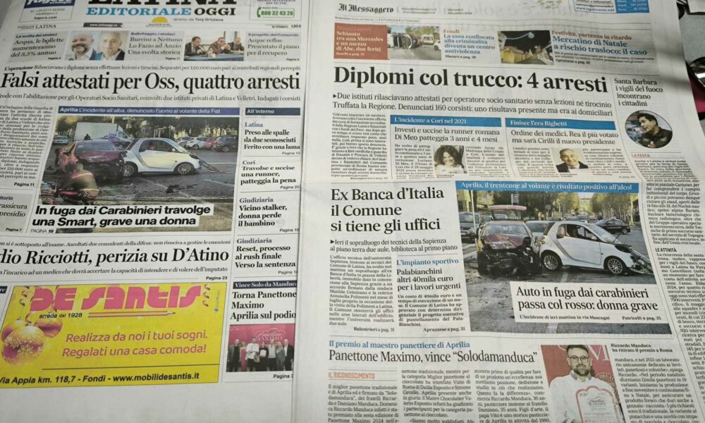 LATINA – Qui trovate Prima Pagina, in un file audio di pochi minuti, i titoli di Latina Editoriale Oggi e del Messaggero Latina. ASCOLTA ...