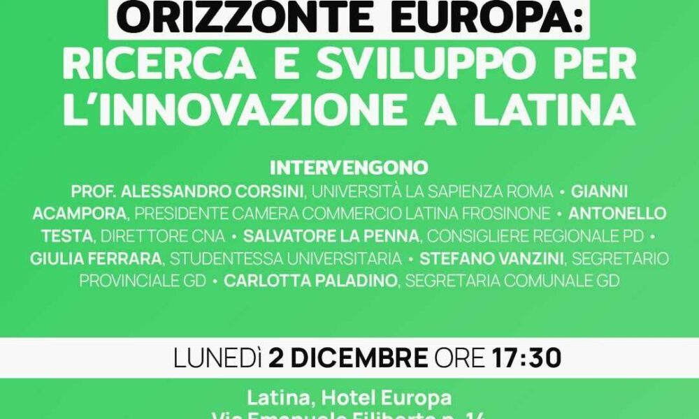 LATINA – Lunedì 2 dicembre alle 17.30 all’Hotel Europa in via Emanuele Filiberto 14, il PD Latina ha organizzato un’iniziativa sul tema Orizzonte Europa. Ricerca e...