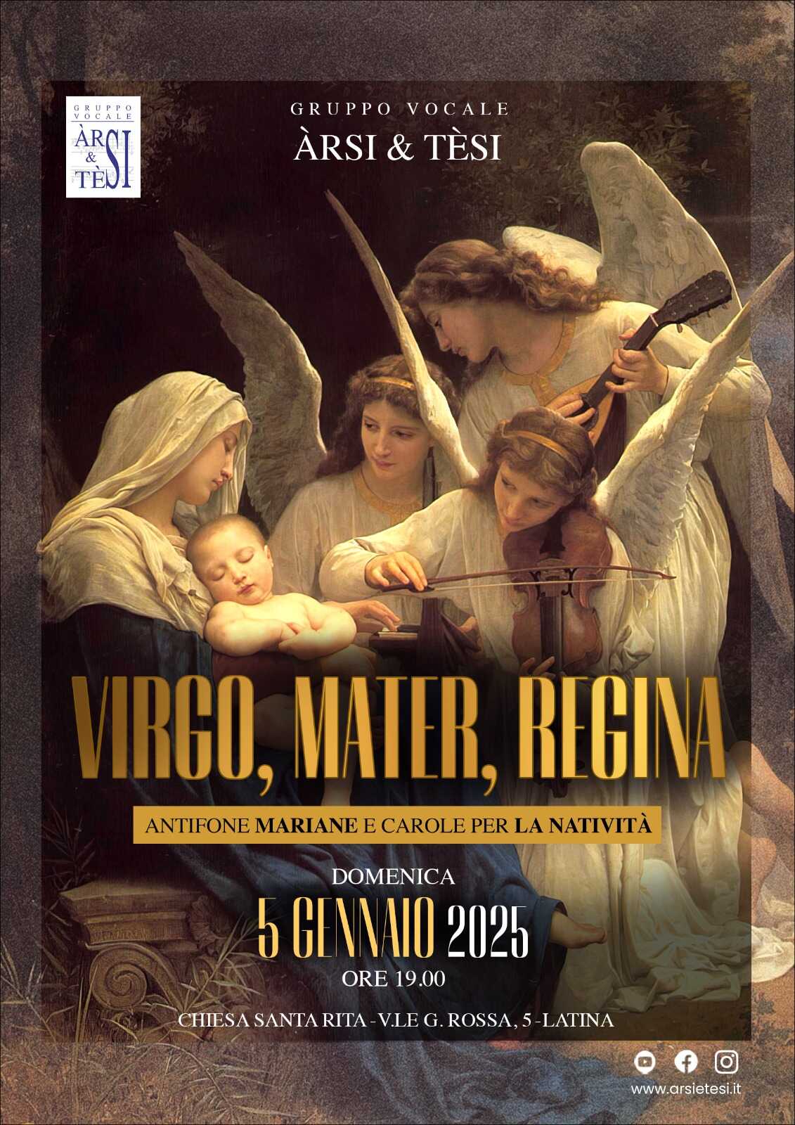 LATINA – “Virgo, Mater, Regina”- Antifone mariane e carole per la Natività. Questo il titolo del concerto polifonico che il gruppo vocale “Arsi & Tèsi” eseguirà domenica 5 gennaio 2025 dalle 19:00 alle 20:00 nella chiesa di Santa Rita a Latina, in viale Guido Rossa n.5.