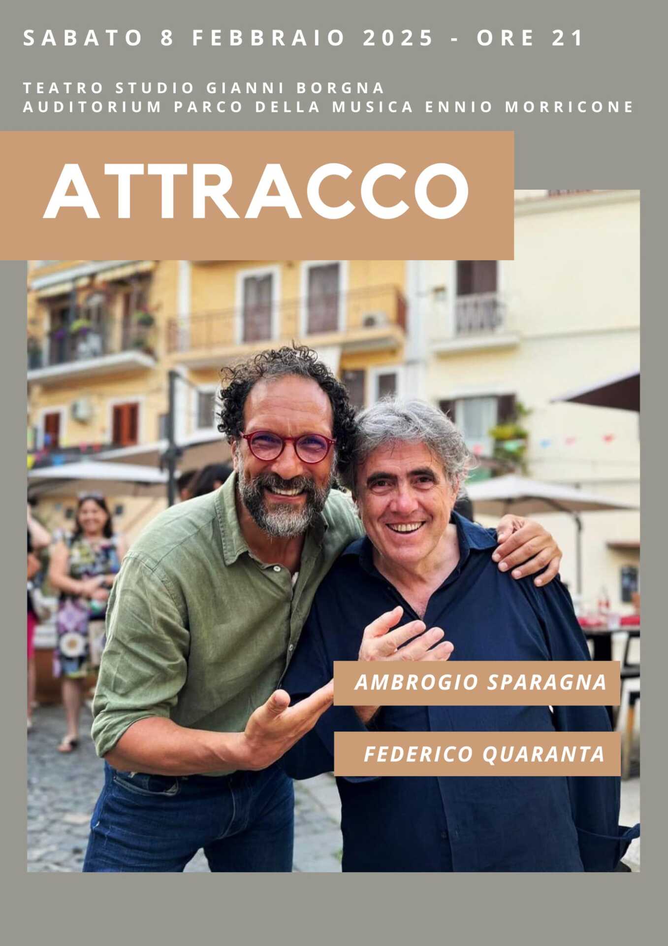 L’appuntamento, l’8 febbraio 2025, al Teatro Studio Gianni Borgna dell’Auditorium Parco della Musica Ennio Morricone, è con “Attracco” questo il nome dello spettacolo. Con il celebre conduttore del Provinciale, Sparagna affronta un viaggio musicale e popolare, che percorre la dorsale appenninica, per raccontare con le sue musiche e la voce narrante di Federico Quaranta, “i crinali e le coste, come un lungo grande attracco di popoli e culture”.