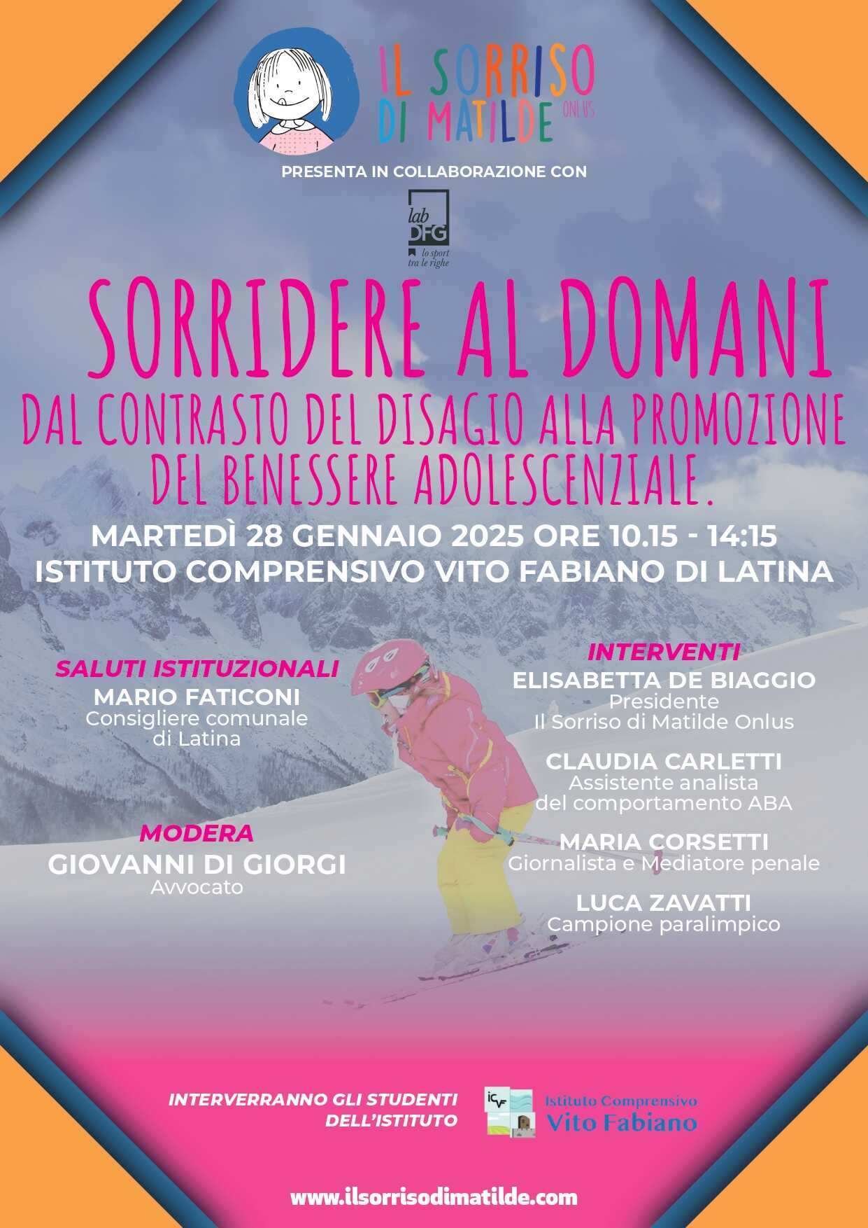 LATINA – Si terrà domani presso l’istituto comprensivo Vito Fabiano di Latina, il secondo appuntamento dell’iniziativa “Sorridere al domani. Dal contrasto del disagio alla promozione del benessere adolescenziale”. Il progetto – promosso da Onlus Il Sorriso di Matilde in collaborazione con la casa editrice Lab DFG – nasce dall’esigenza di contrastare il disagio giovanile, una realtà sempre più complessa che, oggi, richiede interventi mirati e condivisi. E intende aiutare i ragazzi e le ragazze a sviluppare resilienza, autostima e strategie per affrontare le sfide quotidiane, facendo leva sul potere dello sport e della cultura come strumenti universali di inclusione e crescita personale. Lo scopo verrà perseguito attraverso incontri alla presenza di un polo di esperti e professionisti del settore e testimonial campioni sportivi e paralimpici.
