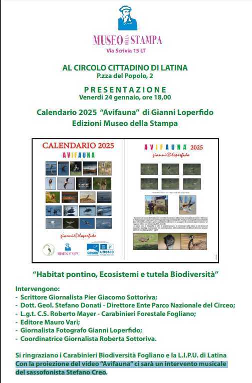 LATINA – “Habitat pontino, ecosistemi e tutela della biodiversità” è il tema di un incontro in programma venerdì 24 gennaio alle 18, al circolo cittadino di Latina in occasione della presentazione del calendario “Avifauna” del fotografo di Latina Gianni Loperfido. Dopo una vita dedicata alle fotografie di mare e di viaggio, un racconto in dodici mesi delle specie di uccelli più affascinanti che è possibile osservare lungo i laghi costieri e negli altri ambienti del Parco Nazionale del Circeo, passeggiando o facendo bird whatching.