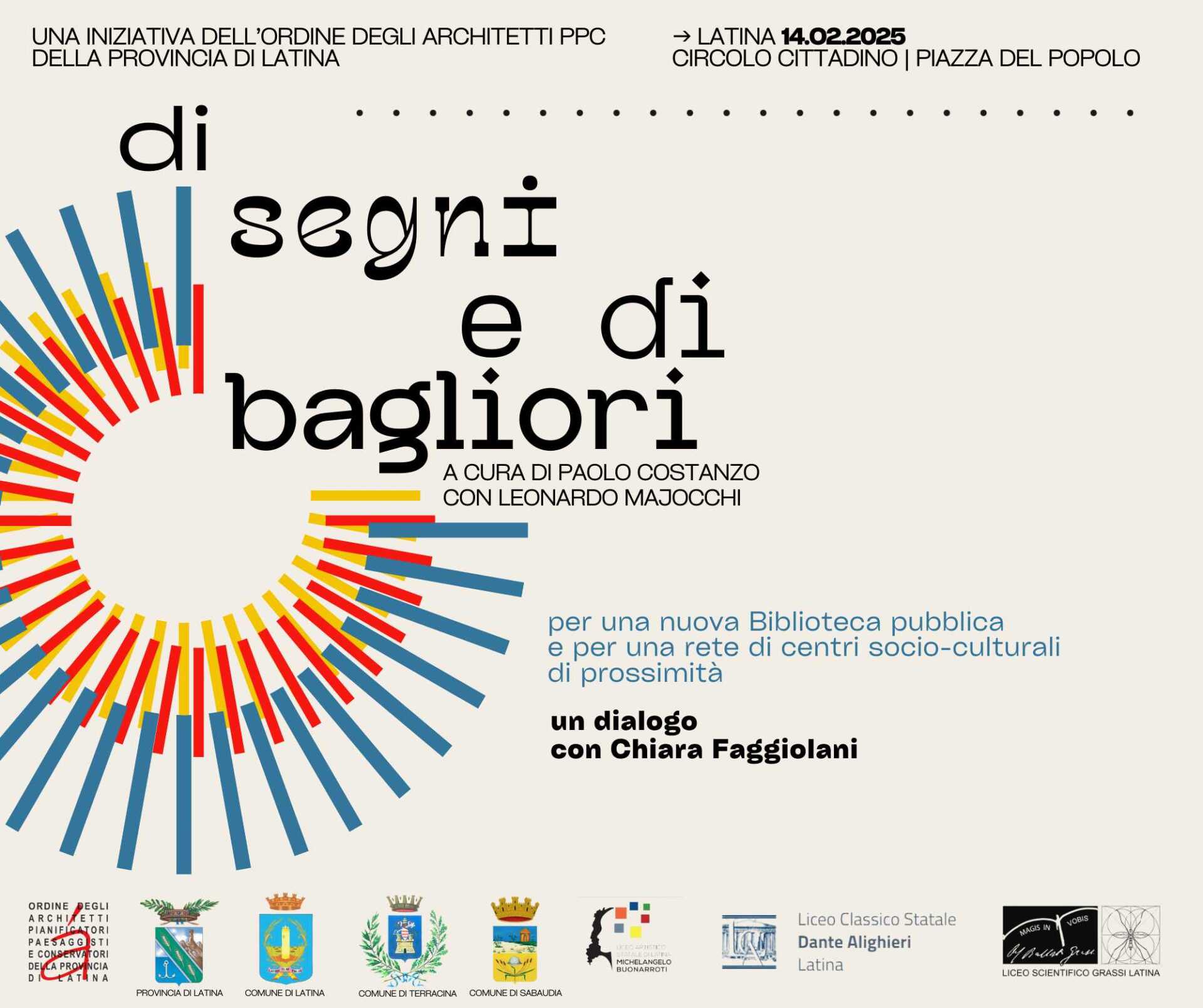 LATINA – Venerdì 14 febbraio, al Circolo Cittadino di Latina, con il patrocinio dell’Amministrazione Provinciale, dei Comuni di Latina, Sabaudia e Terracina, l’Ordine degli Architetti e paesaggisti di Latina organizza la giornata di studio dal titolo “Di segni e di bagliori” a cura di Paolo Costanzo e Leonardo Majocchi, per una nuova biblioteca pubblica e per una rete di centri socio-culturali di prossimità.
