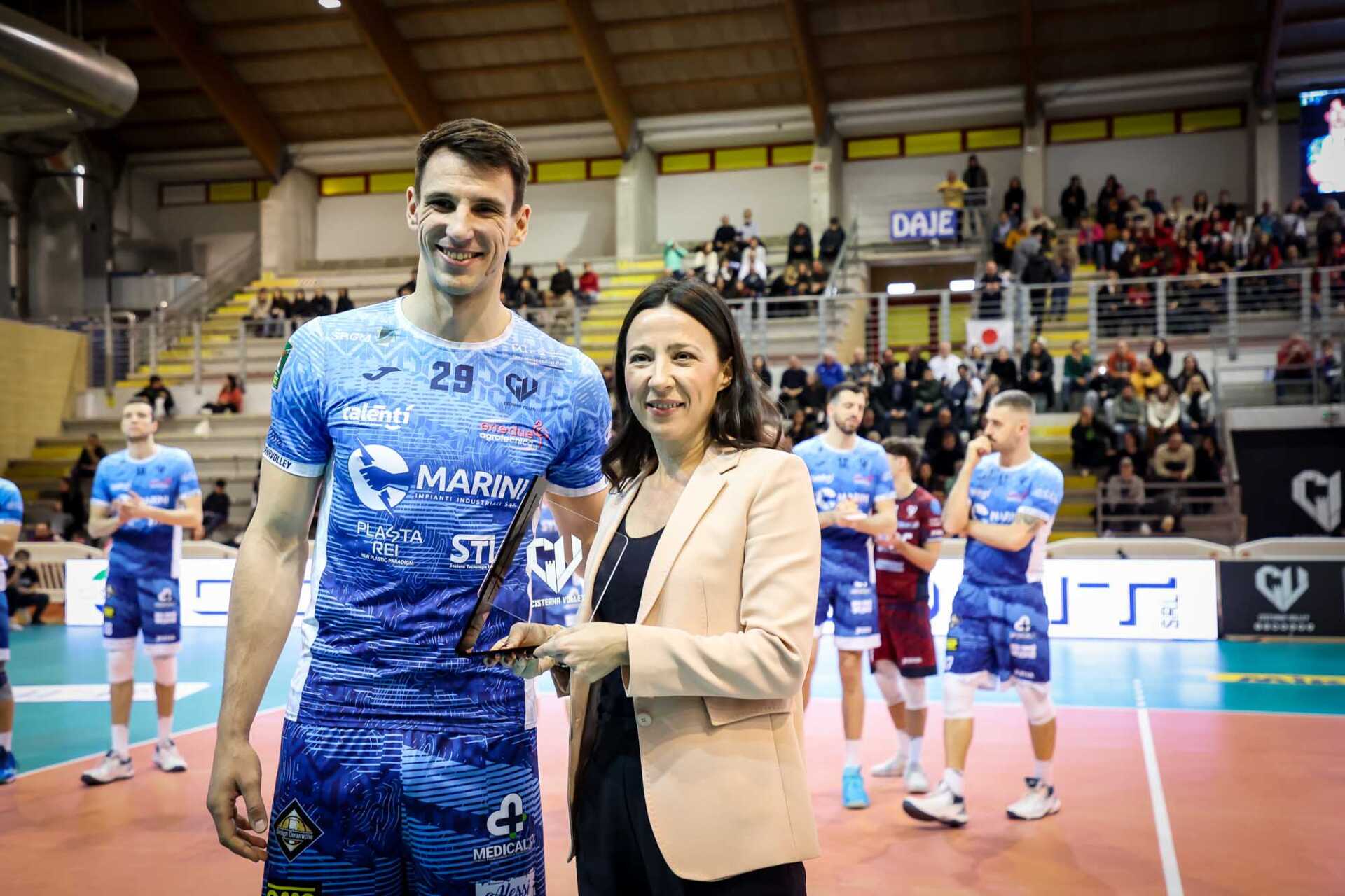 L Prima del match il centrale Aleksandar Nedeljkovic ha consegnato la divisa da gioco del Cisterna Volley all’Ambasciatore della Repubblica di Serbia a Roma, S.E. Sig.ra Mirjana Jeremic. Nel primo set è il Cisterna Volley a partire con il piede giusto, con il muro di Nedeljkovic a segnare il primo vantaggio (4-2), poi Milano, spinta dai colpi di Reggers, passa avanti sul parziale di 8-10. L’ace di Nedeljkovic riporta avanti i pontini sul 13-12, in un set che prosegue combattuto punto a punto. La pipe di Ramon sigla il 18-18, poi sono i meneghini a rompere l’equilibrio con Kaziyski a firmare il 20-22. Il muro di Porro vale il 22-24, Reggers chiude il set in favore di Milano 22-25.