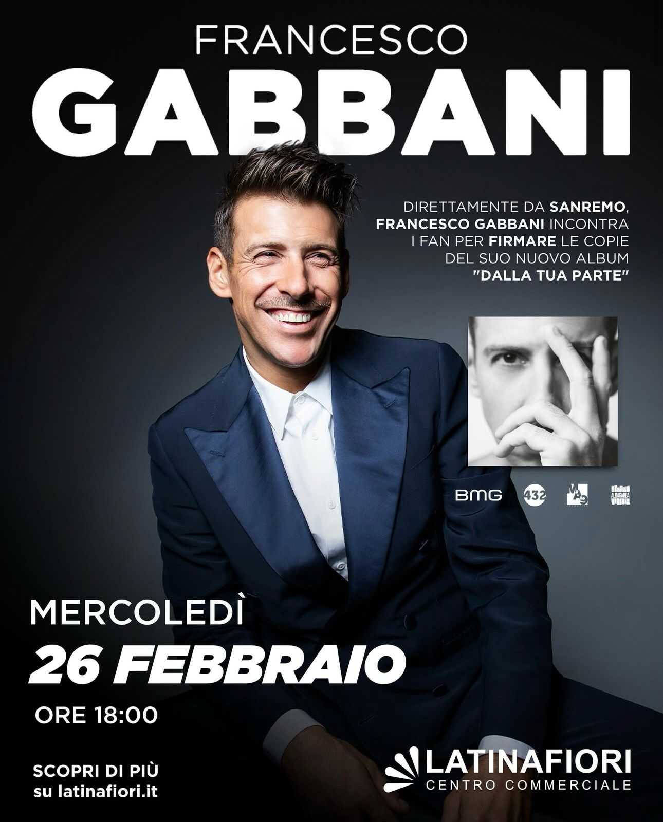 Appuntamento da non perdere Mercoledì 26 Febbraio al Centro Commerciale Latina Fiori: arriva Francesco Gabbani! Direttamente da Sanremo, mercoledì 26 febbraio alle 18, Francesco Gabbani sarà a Latinafiori per incontrare i fan e firmare le copie del suo nuovo album “Dalla tua parte”!