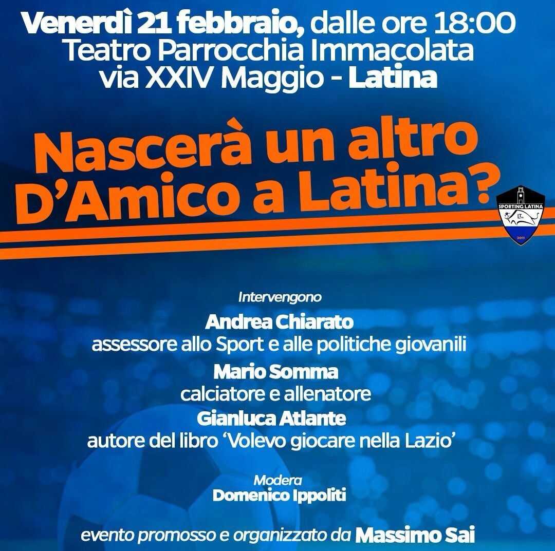 LATINA – “Nascerà un altro D’Amico a Latina?”. E’ il titolo dell’incontro che si terrà questa sera venerdì’ 21 Febbraio alle 18 presso il teatro parrocchiale dell’Immacolata, l’ex Cinema Tirreno di via XXIV Maggio, è stato organizzato da Massimo Sai dello Sporting Latina e sarà incentrato sulla presentazione dei libro di Gianluca Atlante “Volevo giocare nella Lazio” scritto dalla storica firma delle pagine sportive di Latina Oggi per ricordare l’indimenticato campione di Latina venuto a mancare prematuramente. Sarà l’occasione per avviare un dibattito sulle prospettive e le problematiche dello sport e in particolare del calcio pontino. Tra gli altri interverranno anche Mario Somma, noto allenatore e opinionista televisivo Rai, e l’assessore allo Sport e alle Politiche Giovanili del Comune di Latina Andrea Chiarato. Durante l’evento saranno coinvolti genitori e piccoli calciatori e interverranno anche familiari e amici del grande D’Amico: la moglie Simona, il fratello Rosario, il compagno di squadra Giancarlo Oddi e James Wilson, figlio di Pino.
