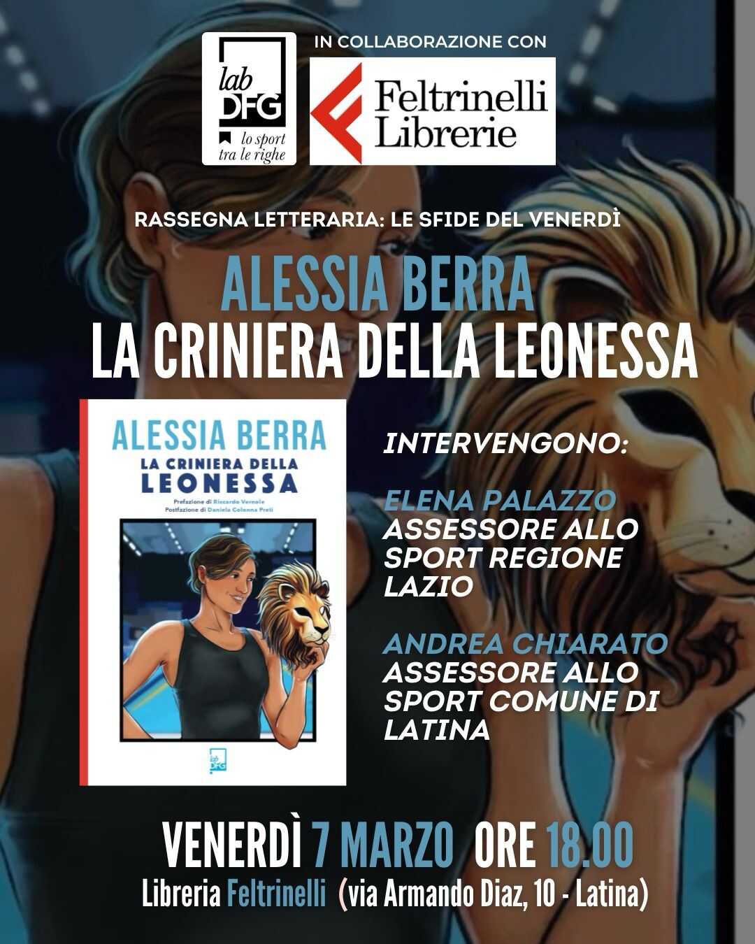 LATINA – Alessia Berra presenta a Latina “La criniera della leonessa” (ed Lab Dfg), il libro nel quale racconta la sua storia di nuotatrice paralimpica. L’appuntamento alla Feltrinelli venerdì 7 marzo segue la sua partecipazione all’ evento “Donne & Sport” promosso dal Soroptimist per giovedì 6 marzo al Museo Cambellotti. Interverranno l’assessore regionale allo sport Elena Palazzo e l’assessore comunale Andrea Chiarato.