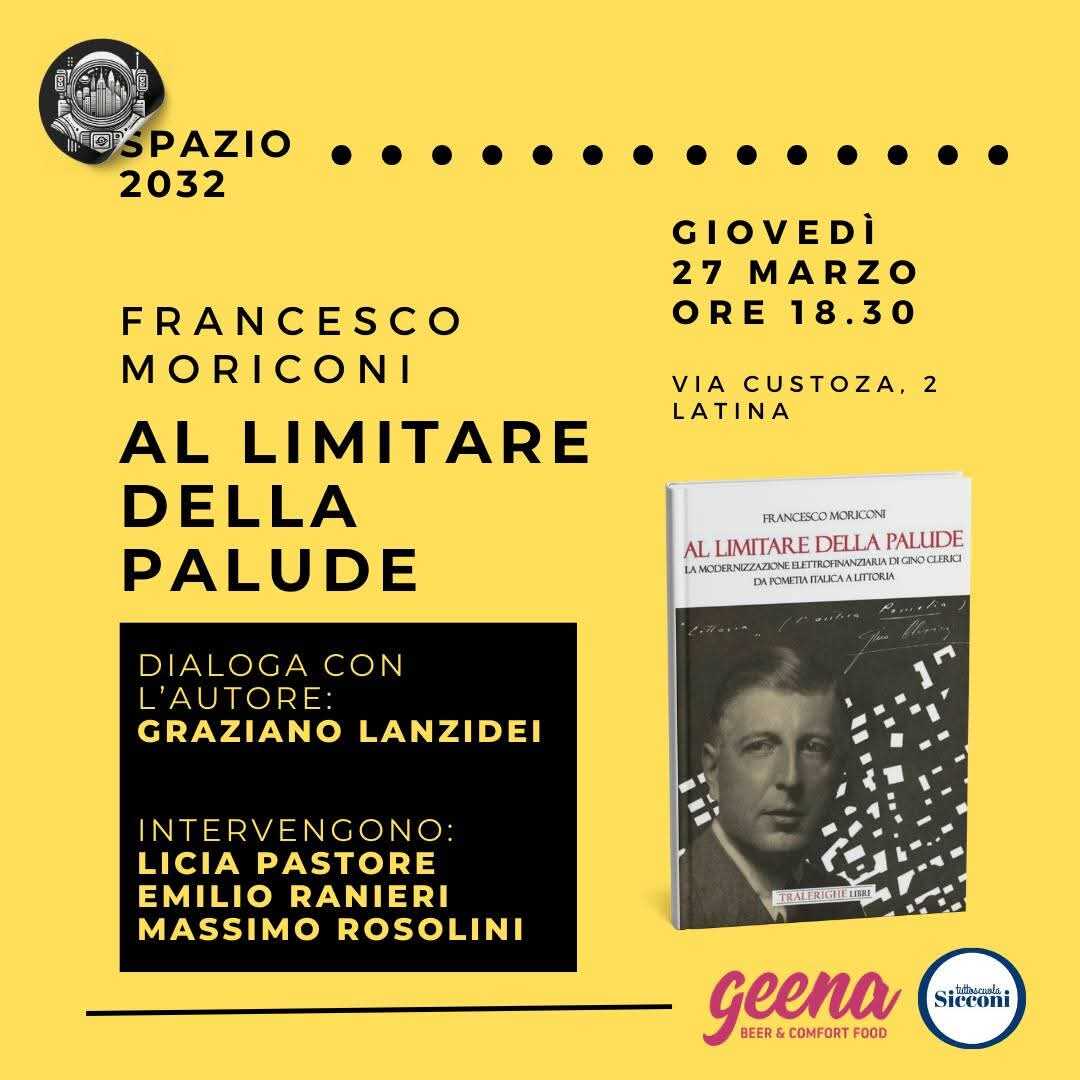 LATINA – Giovedì 27 marzo (alle 18,30), al Geena in Via Custoza a Latina, sarà presentato il libro “Al limitare della palude”, ultima fatica dello storico Francesco Moriconi. Dialogheranno con l’autore Graziano Lanzidei, content maker e critico letterario, fondatore di Spazio 2032 che ha promosso l’evento; la giornalista Licia Pastore, l’ingegnere e urbanista Emilio Ranieri e Massimo Rosolini, architetto presidente dell’Ordine degli Architetti della provincia di Latina.