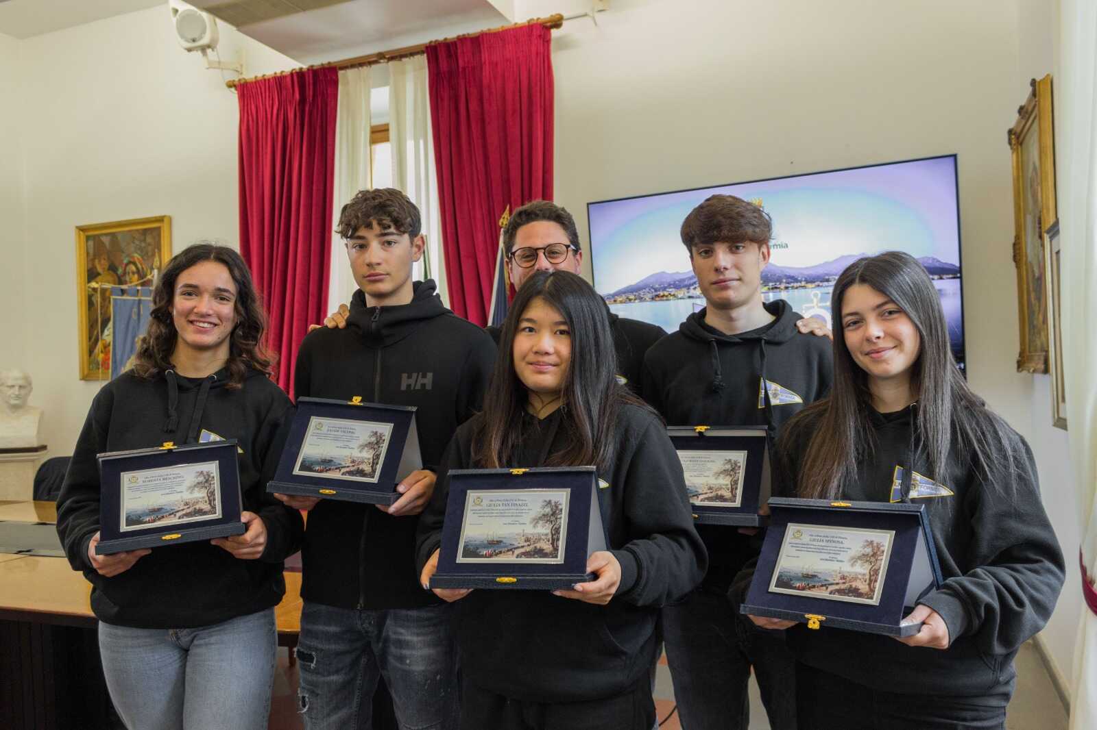 Il Sindaco di Formia Gianluca Taddeo ha premiato questa mattina, nella Sala Sicurezza del Palazzo Comunale, i cinque velisti della Lega Navale Italiana di Formia che si sono distinti in ambito nazionale nell’anno 2024 per le loro performance e l’impegno nel mondo della vela. Atleti che hanno portato onore e lustro all’intera comunità e all’associazione sportiva ottenendo ottimi risultati. A sottolinearlo, nel corso della cerimonia, il primo cittadino che ha espresso il proprio apprezzamento per la dedizione e il sacrificio delle giovani promesse che si allenano nelle acque del litorale di Vindicio, “Lo Stadio del Vento”, evidenziando anche l’importanza dello sport come strumento di promozione del territorio. Il premio è stato un riconoscimento non solo per i traguardi raggiunti, ma anche per lo spirito di squadra e il lavoro svolto nel rappresentare con orgoglio la Lega Navale Italiana di Formia presieduta da Emilio Civita, che ricopre anche il ruolo di direttore sportivo, a testimonianza di un percorso esponenziale di crescita collettiva, frutto anche del prezioso lavoro dell’allenatore Emanuele Montagna.