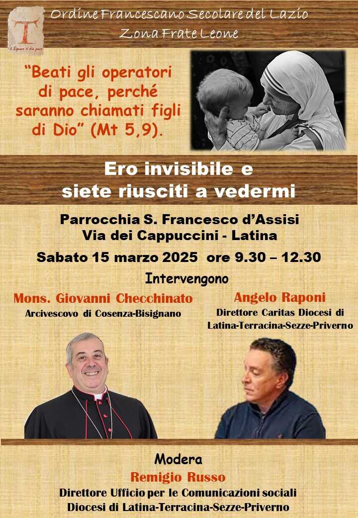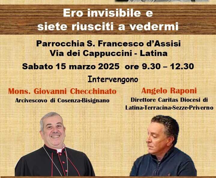LATINA – Si terrà sabato 15 marzo a Latina (9,30- 12,30) nei locali della Parrocchia S. Francesco d’Assisi, il convengo organizzato dall’Ordine Francescano dal titolo “Ero invisibile e siete riusciti a vedermi”, aperto a tutti. Sono previsti gli interventi di mons. Giovanni Checchinato, arcivescovo di Cosenza-Bisignano, già parroco a Latina e di Angelo Raponi, direttore della Caritas diocesana di Latina. «I due relatori si confronteranno sulla piaga dello sfruttamento della manodopera », hanno spiegato gli organizzatori richiamando la tragica morte di Satnam Singh.