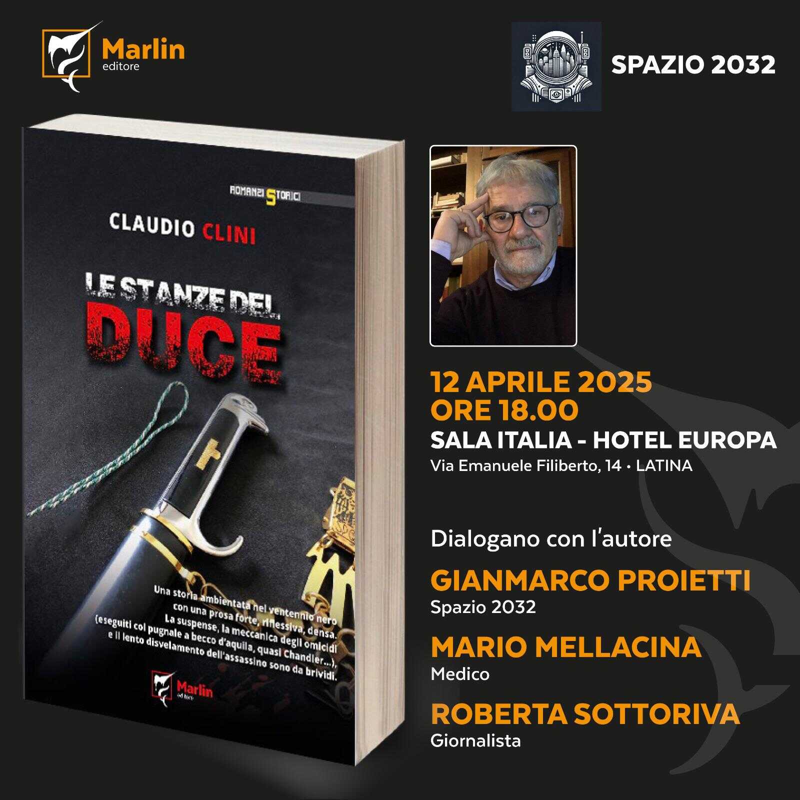 LATINA – Claudio Clini torna a Latina per presentare il suo ultimo romanzo storico, il noir “Le stanze del duce” (Marlin Editore). L’appuntamento sabato 12 aprile alle 18 nella Sala Italia dell’Hotel Europa.