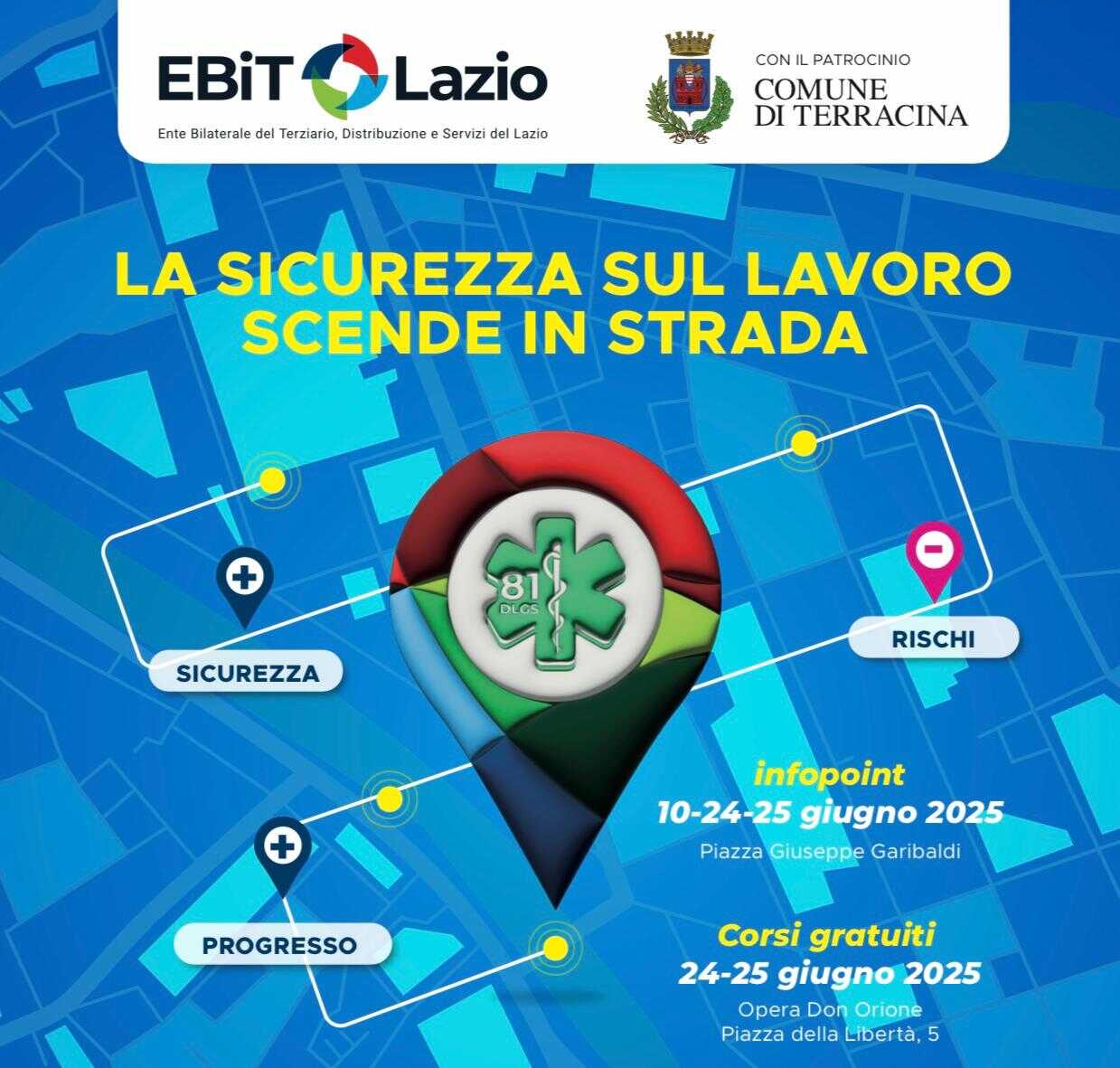 TERRACINA – Più sicurezza, meno rischi, più progresso: la sicurezza sul lavoro scende in strada a Terracina con infopoint e corsi gratuiti. L’iniziativa promossa da Ebit Lazio, l’Ente Bilaterale del Terziario Distribuzione e Servizi del Lazio, con il patrocinio del comune di Terracina è rivolta ai titolari di attività commerciali e ai loro dipendenti ed è nata per divulgare la cultura della prevenzione e della formazione volta a tutelare la salute e la sicurezza nei luoghi di lavoro. L’iniziativa si svolge presso le vie e i centri commerciali situati nei diversi comuni del territorio regionale. Gli infopoint si terranno oggi 10giugno, poi il 24 ed 25 giugno 2025 in Piazza Giuseppe Garibaldi Corsi, i gratuiti 24-25 giugno 2025 presso l’Opera Don Orione Piazza della Libertà, 5 a Terracina.