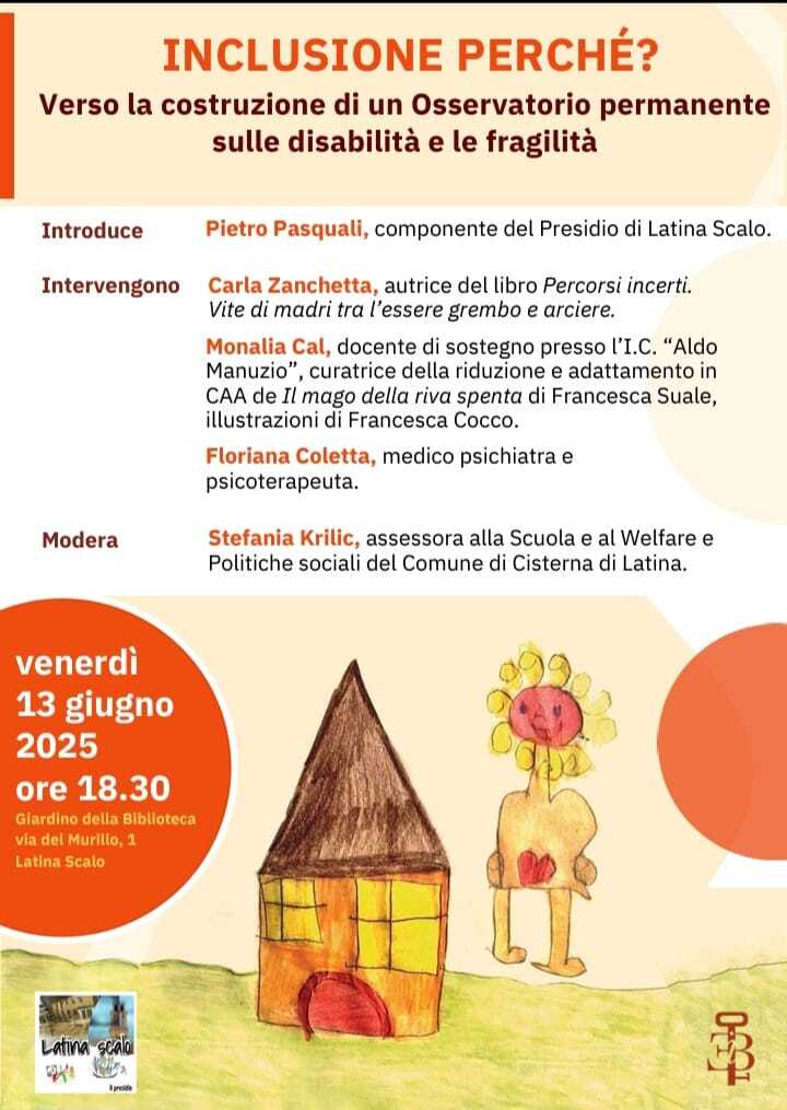 Dopo un primo incontro a Latina promosso dal Tavolo delle Politiche Culturali di LBC, sarà ora il Presidio di Latina Scalo coordinato da Pietro Pasquali a organizzare e a introdurre il nuovo appuntamento, fissato per venerdì 13 giugno, alle ore 18.30, presso il giardino della biblioteca in via del Murillo, 1 a Latina Scalo. L’evento sarà moderato ancora una volta da Stefania Krilic, attuale Assessora alla Scuola e al Welfare e Politiche sociali del Comune di Cisterna di Latina, di cui è riconosciuta la competenza e la grande esperienza nei Servizi Sociali. Con lei dialogheranno l’autrice Carla Zanchetta, Monalia Cal, docente di sostegno presso l’I.C. Aldo Manuzio e facilitatrice CAA (Comunicazione Aumentativa e Alternativa) e Floriana Coletta, medico psichiatra, che alla luce della sua professione sostiene il progetto proposto dalle autrici dei due volumi.
