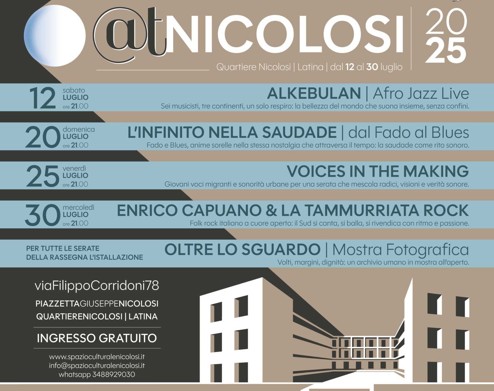 LATINA – Torna nella piazzetta dello storico quartiere Nicolosi di Latina la rassegna estiva @tNICOLOSI, quarta edizione, dal 12 al 30 luglio 2025, performance, musica, installazioni, narrazioni urbane e laboratori, con il patrocinio del Comune di Latina e di ATER della Provincia di Latina, e grazie alla speciale collaborazione di Fondazione Roma, in sinergia con la Cooperativa Astrolabio e SAIP Formazione e Lavoro, a conferma di un’alleanza culturale e sociale che mette al centro le persone, i diritti, e quella forma rara di bellezza che nasce quando nessuno viene lasciato indietro.