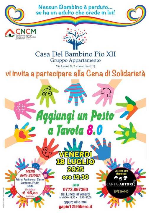 PONTINIA – A Pontinia si rinnova venerdì 18 luglio il tradizionale appuntamento per la raccolta fondi a favore dei piccoli ospiti della struttura. La comunità educativa per minori Casa del Bambino Pio XII di Pontinia ha organizzato anche quest’anno la tradizionale cena di solidarietà dal titolo “Aggiungi un posto a tavola 8.0”. Si tratta di un’iniziativa mirata alla raccolta di fondi per i piccoli ospiti della struttura. L’appuntamento alle 19,30, presso gli spazi di via Leone X sarà accompagnato da una cena e da una serata di festa arricchita dalla musica della live band “Canta Autori”.