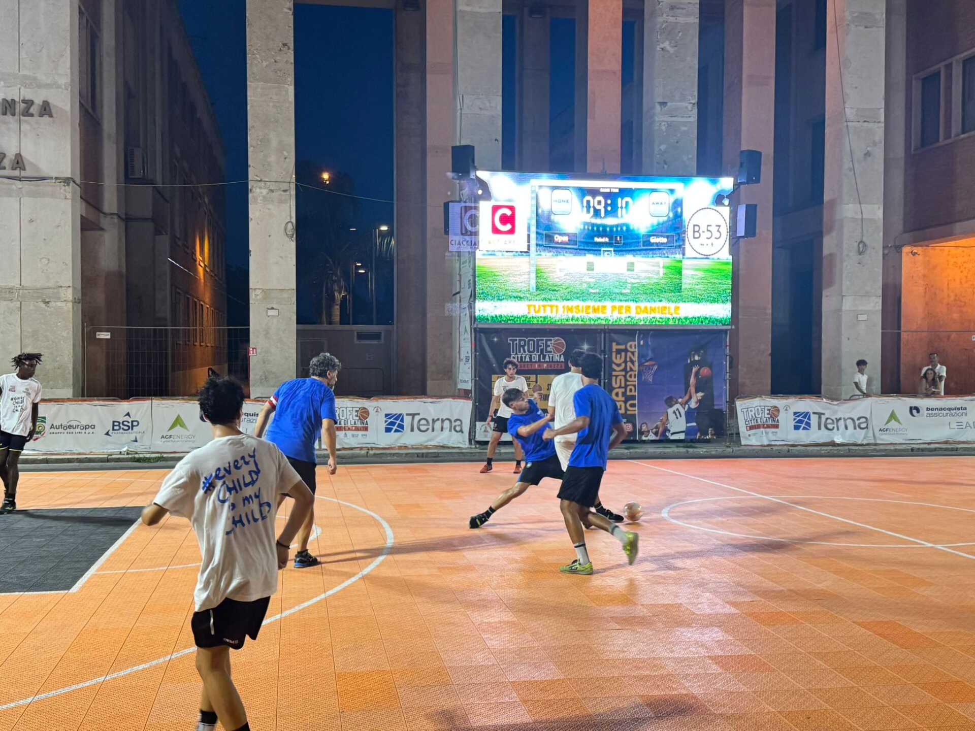 LATINA – Una fortissima emozione scandita dai contuini applausi alla memoria di Daniele Mariani, nella serata a lui dedicata: “Il sorriso di Daniele”. Alla BIP Arena di Piazza del Popolo a Latina si è celebrata la grande amicizia, che ha legato il compianto Daniele ai tanti che ne hanno convidiso i sentimenti dentro e fuori da un campo di calcio. Per cui sono bastate anche due porticine per improvvisare un 5X5 sul parquet gommato, su cui fino a domenica scorsa si è disputato il Trofeo Città di Latina – Baskert in Piazza. Da qui è stato facile dare il nome dalla serata solidale “Quattri calci in piazza” organizzata dall’ amico di sempre di Daniele Mariani, Gennaro Ciaramella, per l’occasione anche animatore della serata come speaker ufficiale: “Ho visto tanti sorrisi, come quello che ci ha lasciato in eredità Daniele, il quale era insieme lavoro, sport, musica e solidarietà. In questa occasione abbiamo raccolto fondi per sostenere l’acquisto di una sedia job per lo stabilimento La Vela, per continuare a dotare, come stanno facendo già altre associazioni, il nostro lido, di strutture che favoriscano l’inclusività e quindi la possibilità per tutti di godersi il mare. Ringrazio per la disponibilità Gli Amici del Basket e l’Opes, che hanno reso possibile tutto questo”.