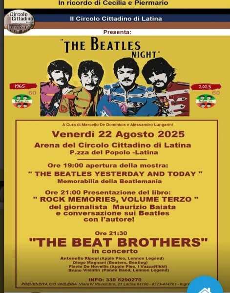Volume Terzo” del giornalista Maurizio Baiata e conversazione sui Beatles con l’autore. Alle 21:30, infine, sarà il turno dei “The Beat Brothers” in concerto: Antonello Ripepi (Apple Pies, Lennon