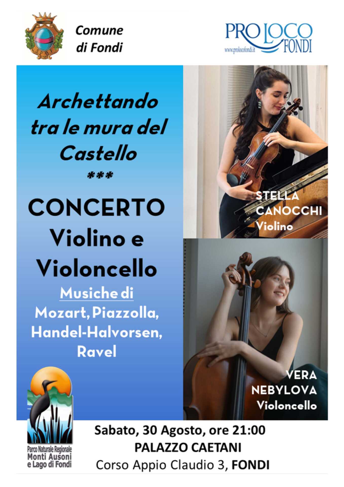 L’Associazione Pro Loco Fondi APS, con il patrocinio gratuito dell’Ente Parco Naturale Regionale Monti Ausoni e Lago di Fondi, presentano l’evento musicale “Archettando tra le mura del Castello”, che si terrà sabato 30 agosto alle ore 21:00 nella suggestiva Sala Grande di Palazzo Caetani (Corso Appio Claudio 3, Fondi). Ingresso libero fino ad esaurimento posti.