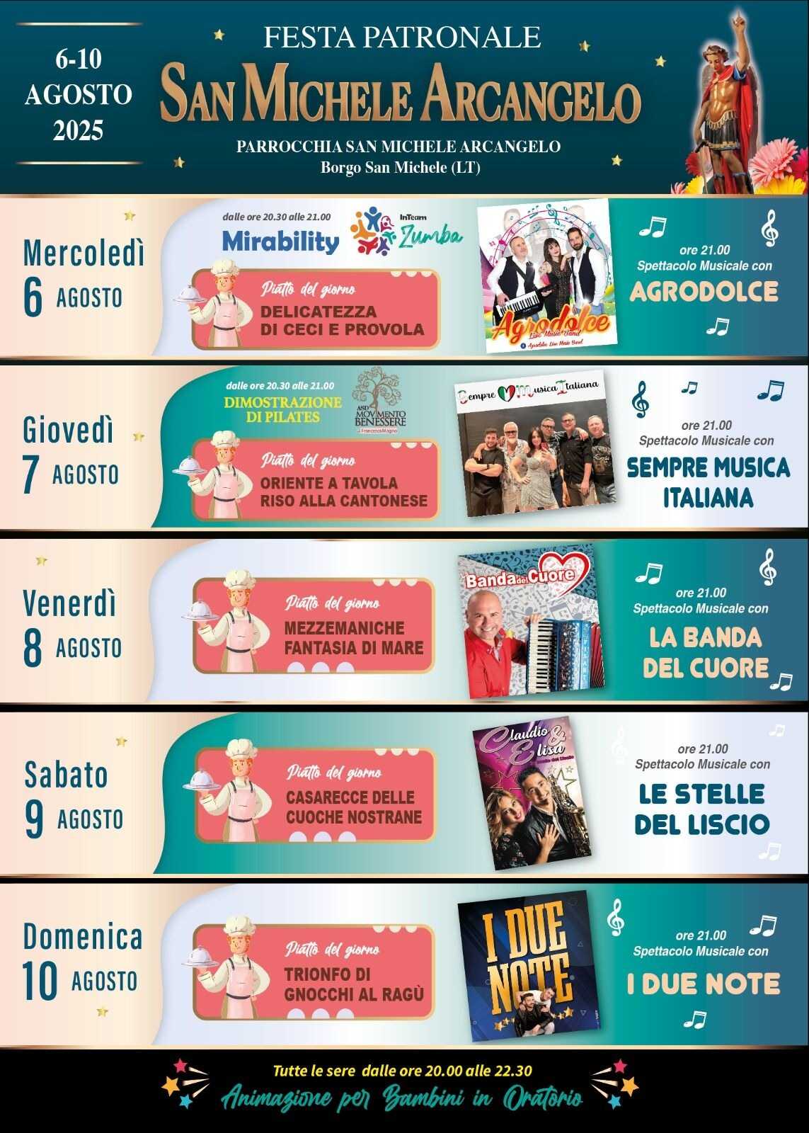 Tutte le serate saranno accompagnate dall’animazione per i bambini in oratorio dalle 20:00 alle 22:30