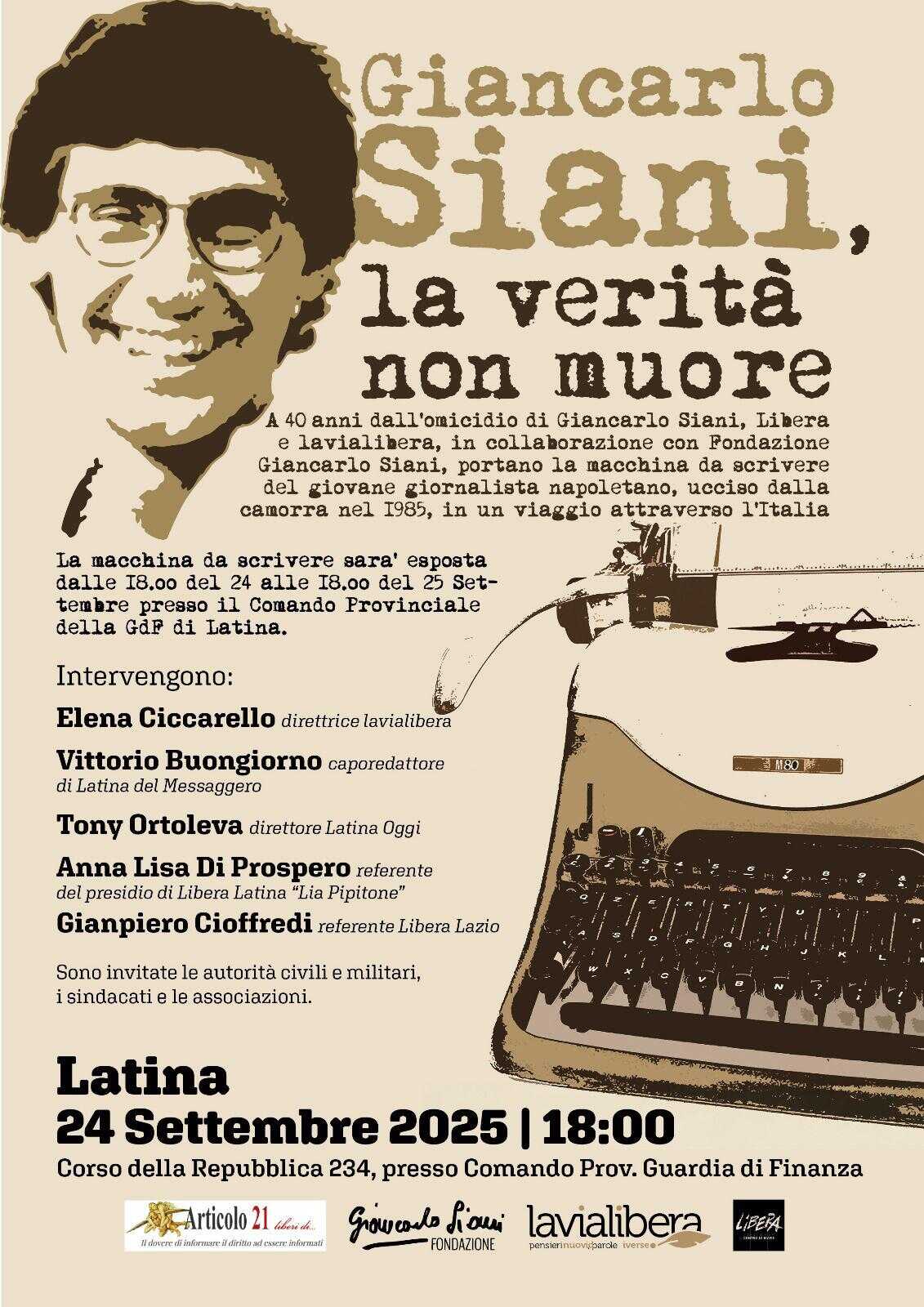 LATINA – La macchina da scrivere di Giancarlo Siani, il giornalista ucciso a Napoli dalla camorra nel 1985, arriva a Latina e Fondi dove sarà esposta al pubblico. L’iniziativa è promossa da Libera, lavialibera e Articolo 21 ed è parte di un viaggio in treno attraverso l’Italia. La Olivetti M80 con cui Giancarlo Siani ha scritto oltre 650 tra articoli e inchieste, dal 1979 al 1985 sarà eesposta per 24 ore, dalle 18 del 24 settembre alla stessa ora del giorno successivo presso il Comando provinciale della Guardia di Finanza.