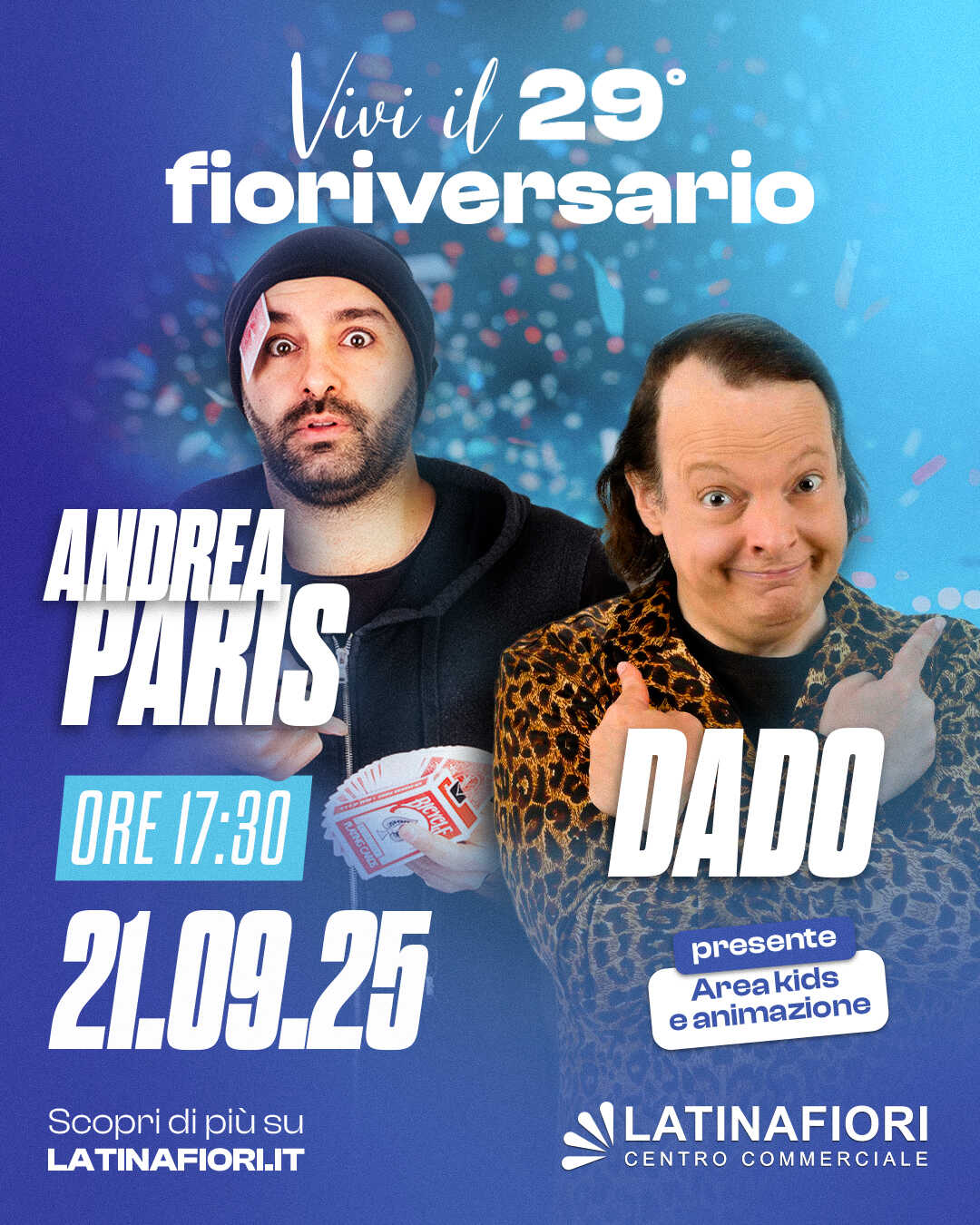 LATINA – Il Centro Commerciale Latinafiori celebra i suoi 29 anni con un grande evento dedicato soprattutto alla città. “Il Fioriversario, così lo abbiamo chiamato quest’anno, è fissato per domenica 21 settembre, a partire dalle ore 17:30”, dicono gli organizzatori che presentano un programma di intrattenimento con spettacoli e attività pensate per tutte le età. Sul palco principale due ospiti d’eccezione: Andrea Paris, mago e mentalista tra i più apprezzati del panorama nazionale, e Dado, comico e volto storico di Zelig, pronto a regalare momenti di ironia e leggerezza. Non mancheranno inoltre attività dedicate ai più piccoli: l’area kids ospiterà laboratori per un intrattenimento creativo, trasformando il compleanno del Centro in una festa per tutta la famiglia.