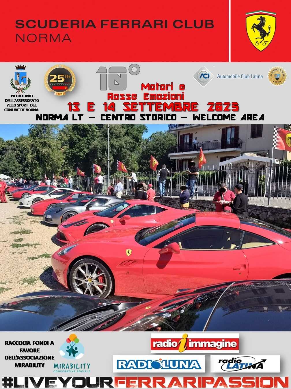 NORMA – Tutto pronto per l’evento motoristico regionale per eccellenza, la manifestazione colorata di Rosso Ferrari che ogni anno proietta Norma su una prestigiosa ribalta di assoluto rilievo: il 13 e il 14 settembre andrà in scena infatti “Motori e Rosse Emozioni”, l’appuntamento organizzato dallo Scuderia Ferrari Club con il coinvolgimento dei più quotati team e possessori di gioielli di Maranello provenienti da tutto il Lazio e non solo. La tanto attesa due giorni, tra l’altro, assumerà quest’anno una valenza particolare: il 2025 coincide infatti con il 25esimo anniversario della nascita del Club, tra i più longevi e i più affermati a livello nazionale, e anche con la decima edizione della rassegna, unica nel suo genere in tutta la regione. Per celebrare la cifra tonda il presidente Benedetto Catalani ed il suo affiatato staff hanno deciso di lanciare una serie di novità, a partire dall’introduzione di un regolamento per la selezione delle vetture partecipanti. I nuovi criteri serviranno ad aumentare la qualità dei gioielli che domenica 14 si vedranno sfrecciare lungo il tradizionale “Circuito Norbano”, alle porte del paese. Quel giorno e per tutto il giorno si potrà assistere alle esibizioni di sfavillanti Ferrari, ma anche di numerose auto da competizione e di vari modelli di diverse tipologie presentati da affermati club. Già confermata, a tal proposito, la presenza di alcune rombanti monoposto e di spettacolari prototipi, molto più numerosi rispetto al passato.