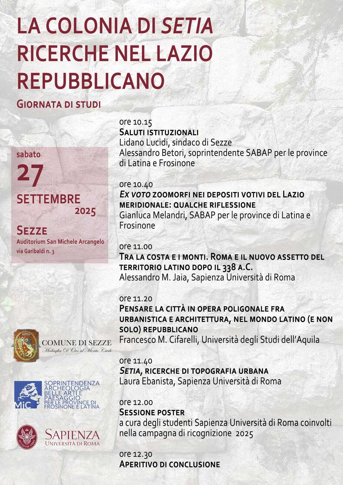 Il programma prevede interventi di studiosi e ricercatori che presenteranno i risultati delle più recenti ricerche dedicate alla storia, all’archeologia e all’urbanistica del territorio. La presenza del Soprintendente A. Betori darà ulteriore valore a un evento che rappresenta un’occasione unica per riscoprire un capitolo fondamentale del passato di Sezze e dell’intero Lazio.