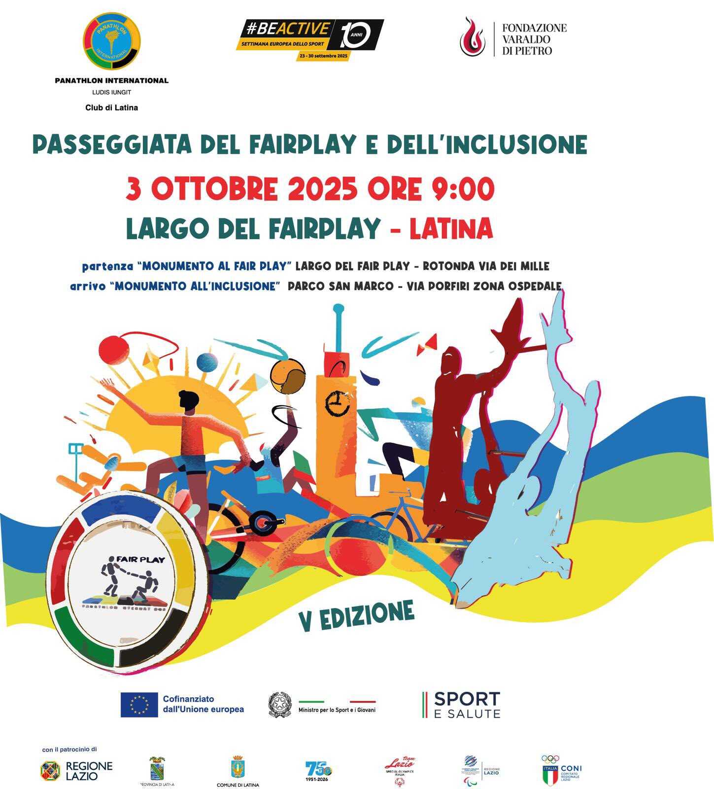 LATINA – Torna a Latina “La passeggiata del Fair Play e dell’inclusione”: venerdì 3 ottobre alle 9 del mattino, sportivi, studenti e insegnanti delle scuole, cittadine e cittadini potranno unirsi all’iniziativa del Panathlon Club Latina che partirà da Largo del Fair Play, nei pressi dello stadio di calcio Domenico Francioni, con l’obiettivo di “promuovere la cultura sportiva quale straordinario catalizzatore di valori universali positivi, veicolo di inclusione, partecipazione e aggregazione sociale”. L’edizione 2025 sarà la quinta di questa speciale iniziativa sostenuta dalla Fondazione Varaldo Di Pietro con il patrocinio della Regione Lazio, della Provincia di Latina, del Comune di Latina e del Coni.