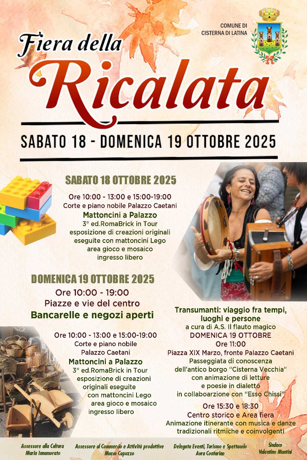 LATINA – Torna questo fine settimana uno degli appuntamenti più attesi dell’autunno cisternese: la Fiera della Ricalata, in programma sabato 18 e domenica 19 ottobre nel cuore del centro storico di Cisterna di Latina. Due giornate di eventi, esposizioni, shopping, animazioni e iniziative per grandi e piccini, tra commercio, cultura e tradizioni locali.