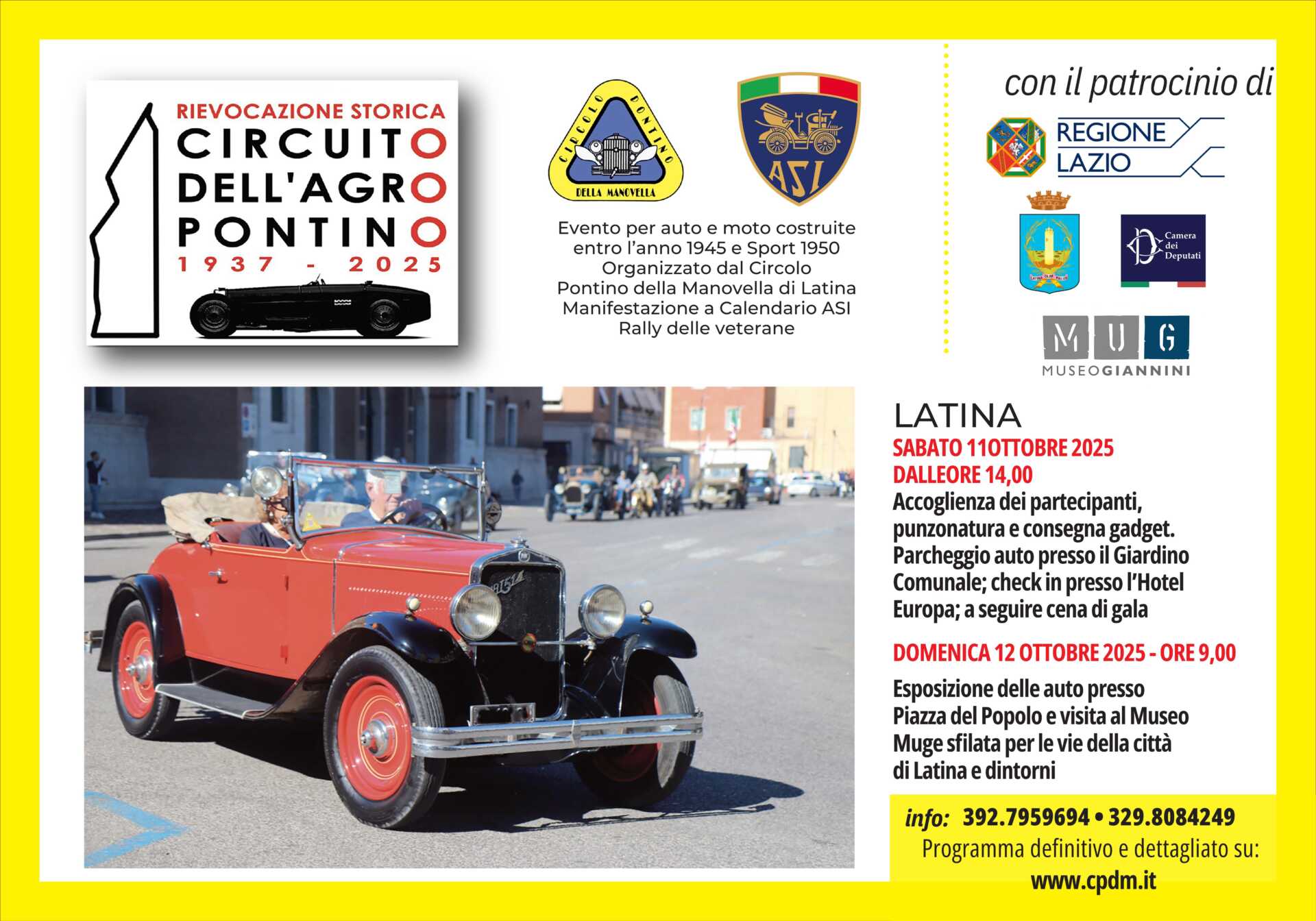 La rievocazione storica del Circuito dell’Agro Pontino è promossa dal Circolo Pontino della Manovella in collaborazione con l’ASI (Automotoclub Storico Italiano) e il Comune di Latina. Per il suo valore storico-culturale, si fregia del patrocinio della Camera dei Deputati e della Regione Lazio. L’evento è libero e gratuito.