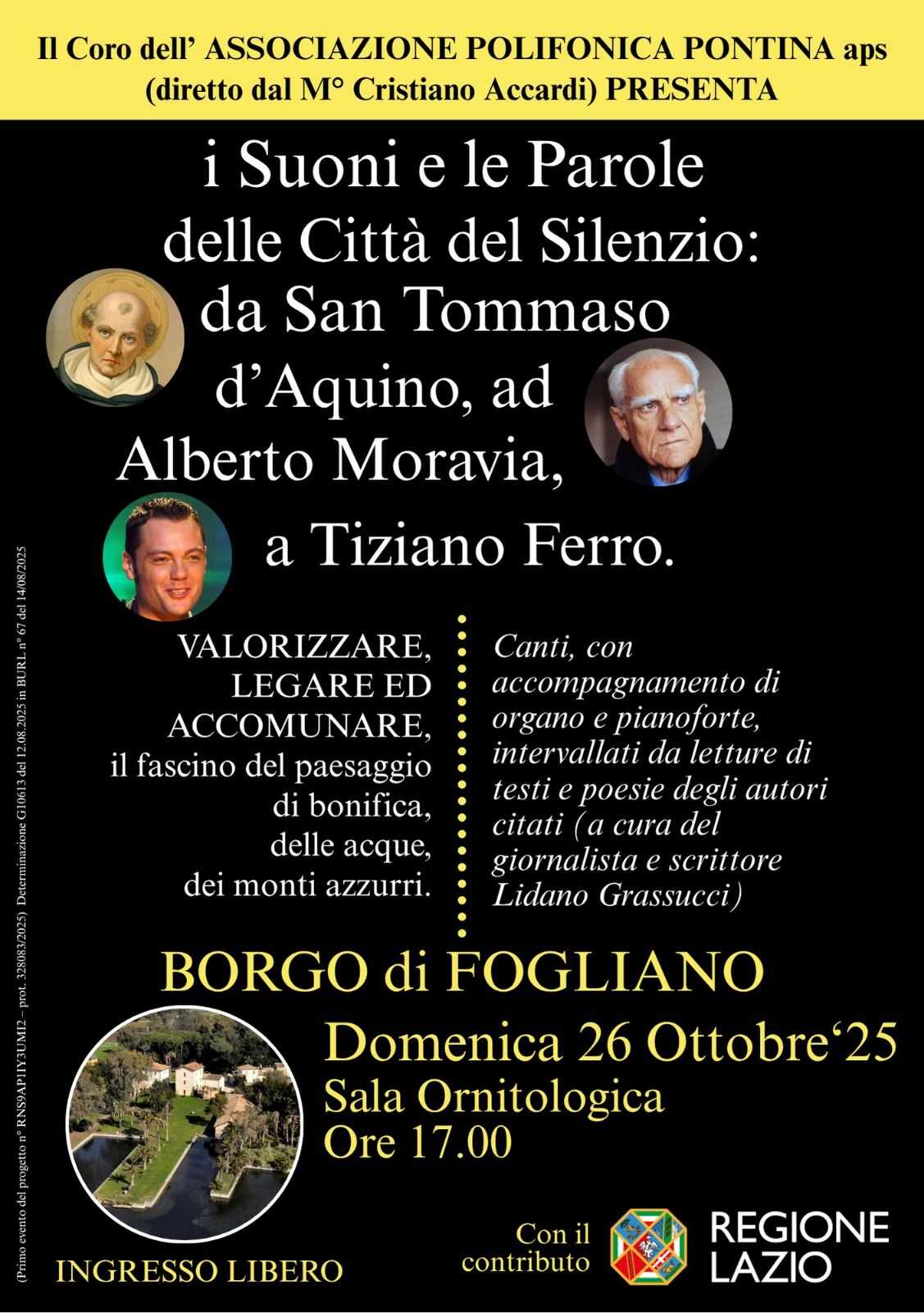 LATINA – Si terrà domenica 26 ottobre (alle 17) a Fogliano, il concerto della Polifonica Pontina dal titolo “I Suoni e le Parole delle Città del Silenzio: da San Tommaso d’Aquino, ad Alberto Moravia, a Tiziano Ferro”, evento inserito nel quadro delle iniziative della Regione Lazio per la promozione e valorizzazione del territorio regionale. A dirigere il coro il maestro Cristiano Accardi.