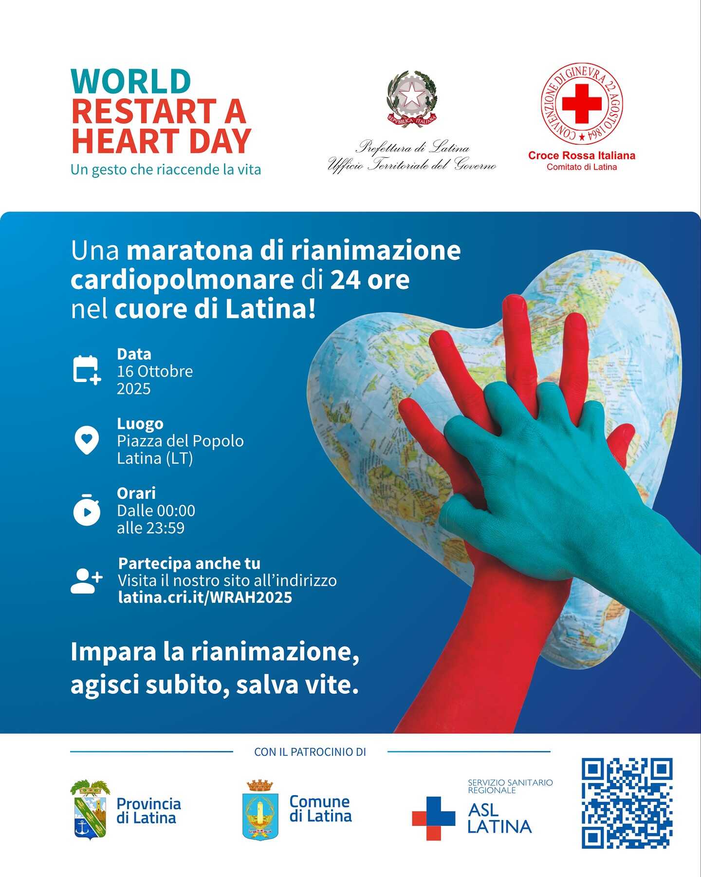 LATINA – Dopo il grande successo della prima edizione, torna a Latina la maratona di rianimazione cardiopolmonare (RCP) promossa dalla Croce Rossa Italiana – Comitato di Latina, in occasione della Giornata Mondiale della Rianimazione (World Restart a Heart Day), in programma il prossimo 16 ottobre 2025, dalle ore 00:00 alle ore 23:59, in Piazza del Popolo.