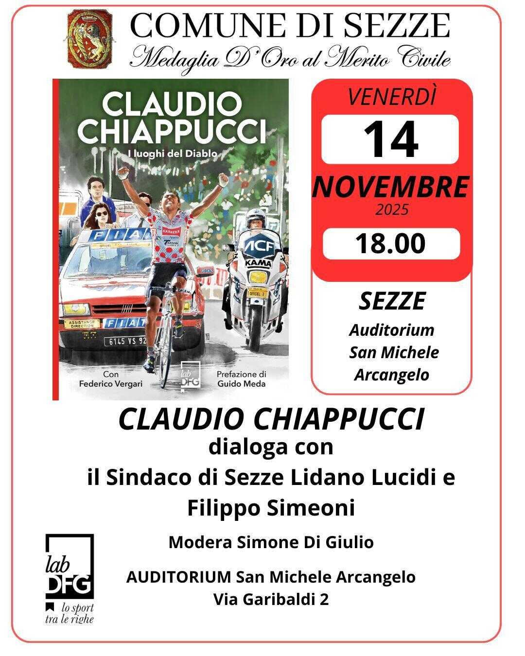 SEZZE – Sarà presentato a Sezze, il 14 novembre alle ore 18 presso l’auditorium San Michele Arcangelo, il libro “I luoghi del Diablo”, del grande ciclista Claudio Chiappucci e con il giornalista sportivo Federico Vergari. La presentazione, che sarà in concomitanza con l’uscita del libro edito dalla casa editrice pontina Lab DFG, vedrà l’autore dialogare con il sindaco di Sezze Lidano Lucidi e con l’ex ciclista Filippo Simeoni.