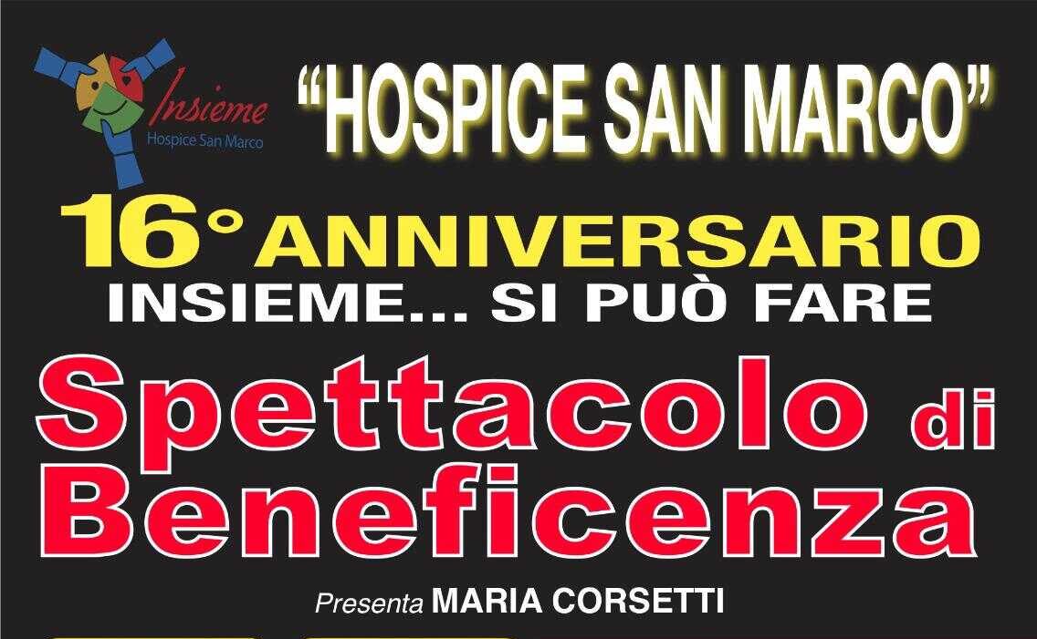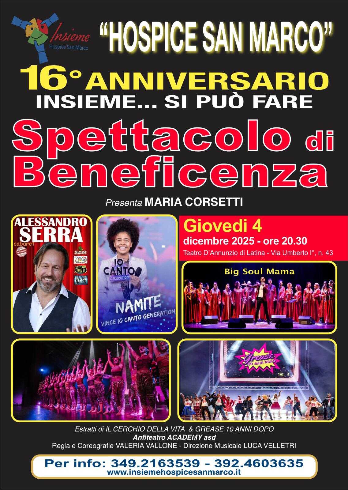 Quest’anno festeggiamo il 16º anniversario dell’Hospice San Marco. Sedici anni di umanità, di dignità, di vicinanza. E come sempre lo facciamo insieme alla città, con uno spettacolo che ormai i cittadini di Latina conoscono bene e attendono con affetto.